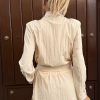 Blazer elegante en color beige, confeccionado en un tejido fluido que aporta movimiento y sofisticación a la silueta. Presenta hombros estructurados que realzan la figura y un cinturón a juego que permite ajustar la prenda a la cintura, acentuando su forma femenina y estilizada. Su diseño versátil y refinado lo convierte en una pieza ideal tanto para ocasiones formales como para un look de oficina moderno. Forma parte de un conjunto coordinado, con pantalón disponible para completar el total look con un aire contemporáneo y minimalista.
