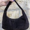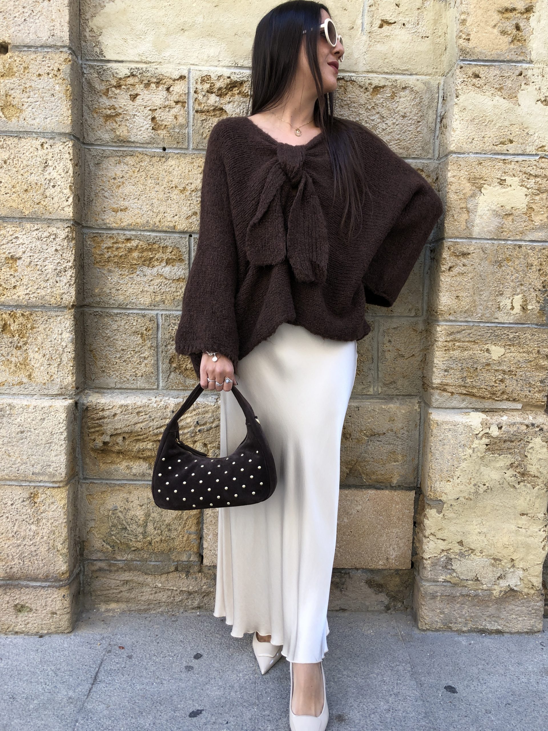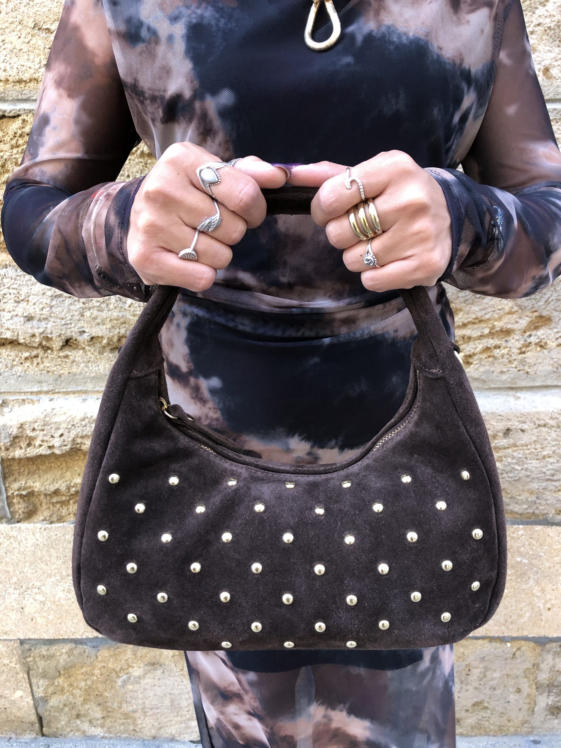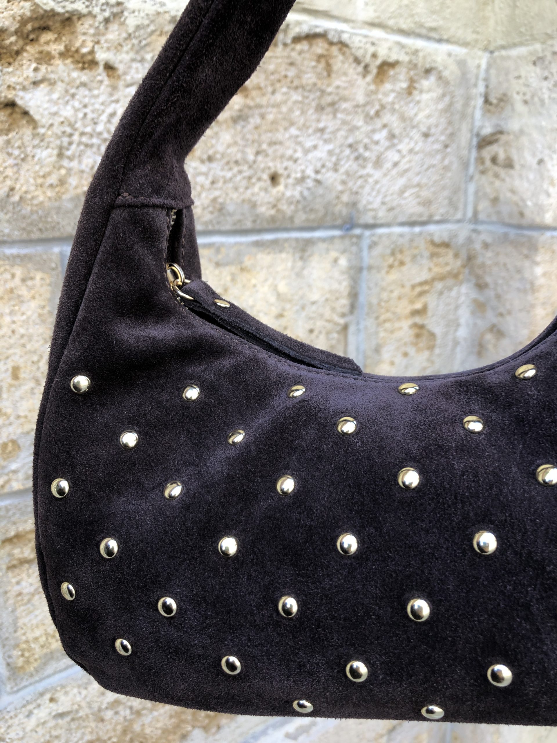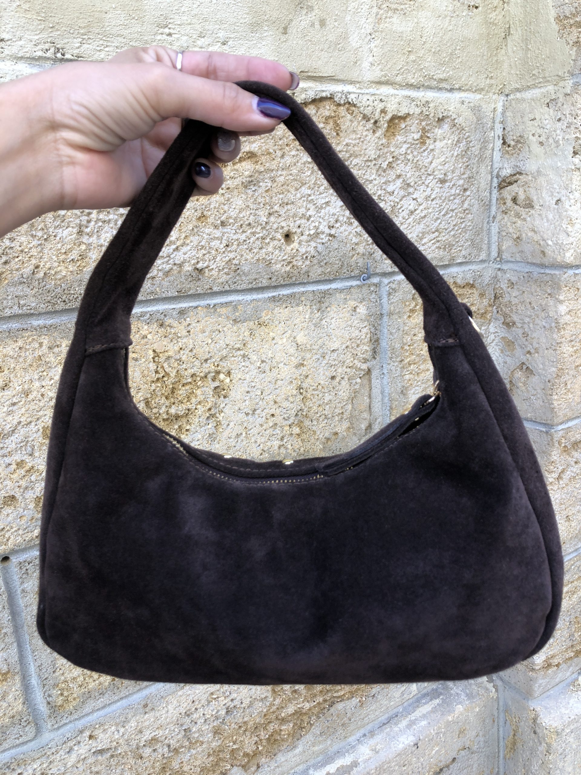 Descubre la elegancia atemporal de este bolso de ante en tono marrón chocolate, una pieza imprescindible para elevar cualquier look. Su textura suave y aterciopelada aporta un toque sofisticado, mientras que los detalles dorados —discretos pero luminosos— añaden un brillo sutil que realza su diseño.