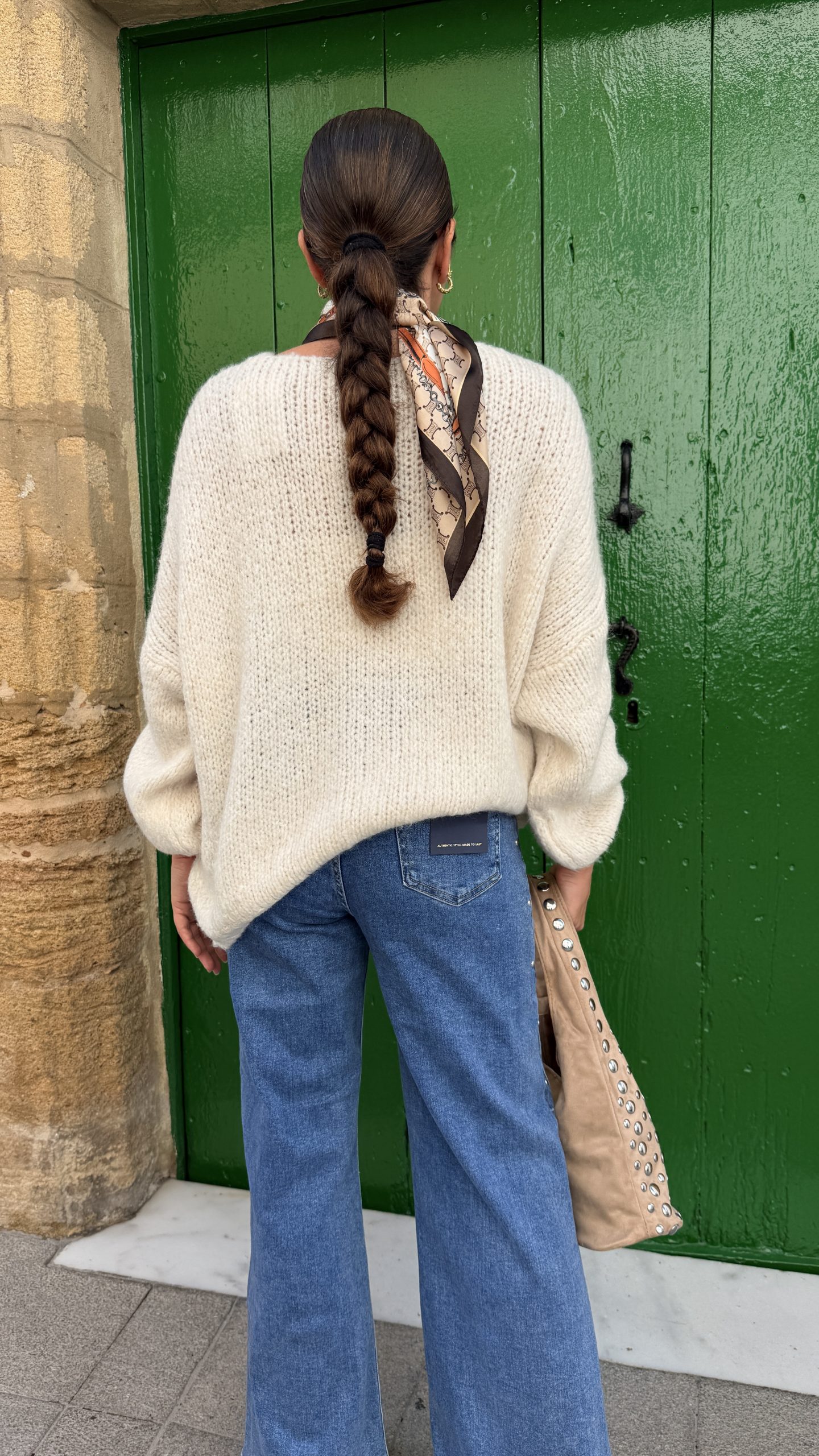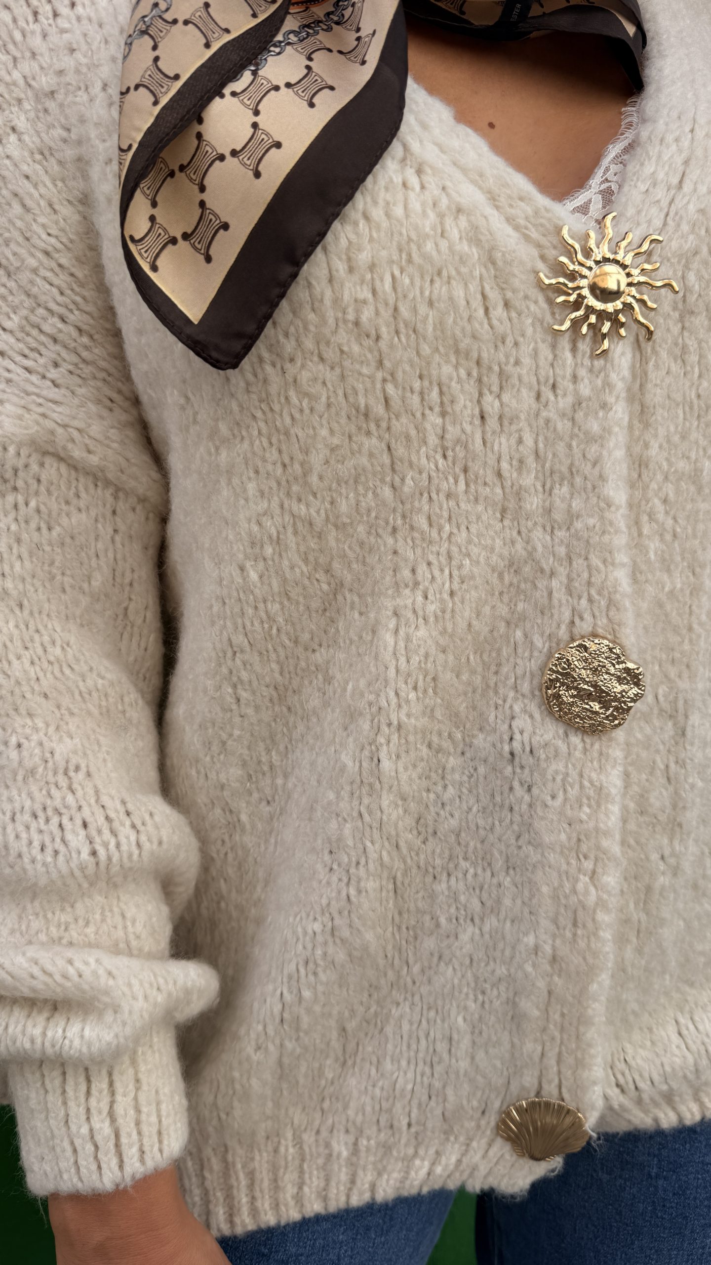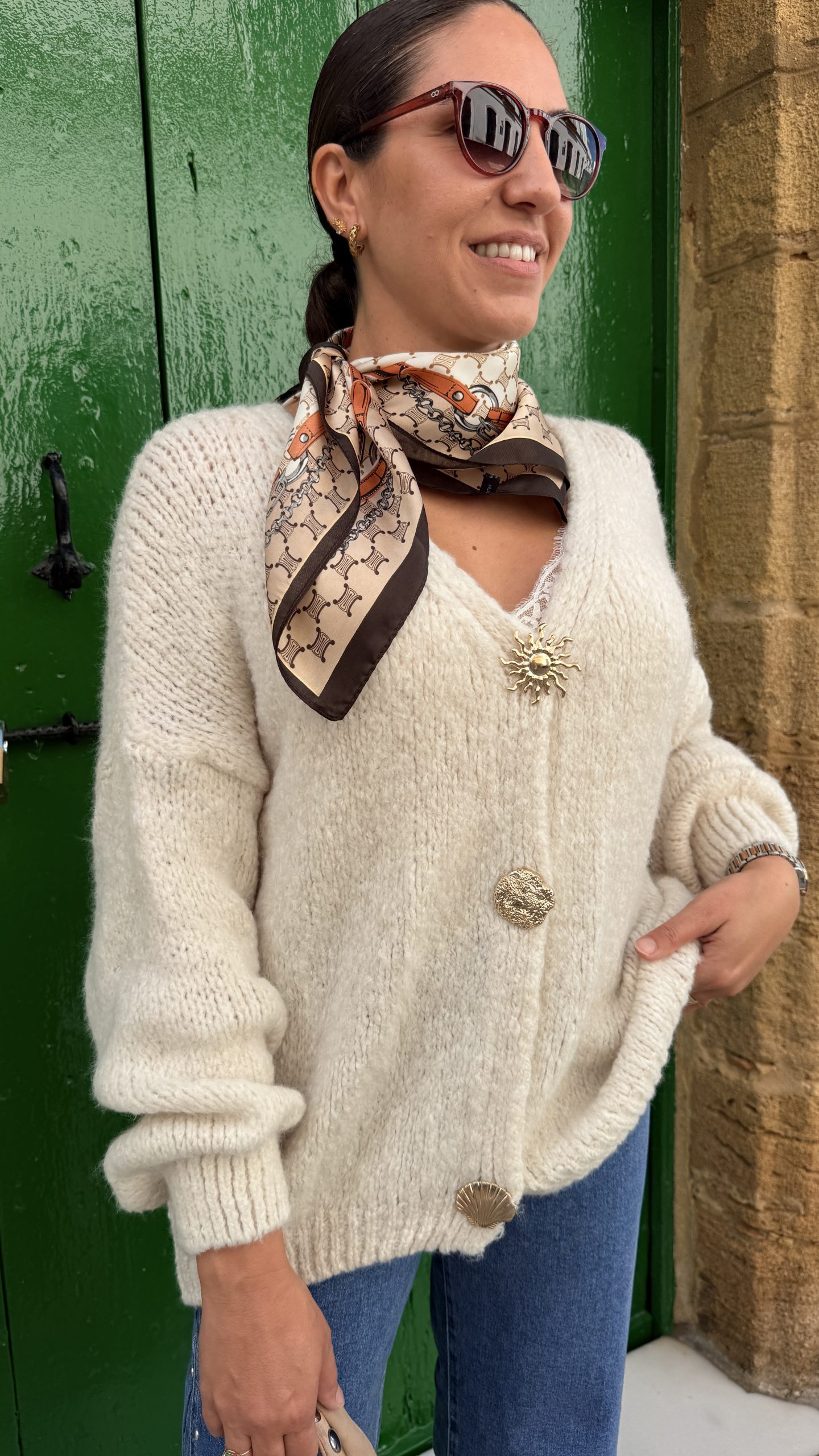 Este cárdigan tejido a punto es la prenda perfecta para completar cualquier look con un toque de estilo y comodidad. Su diseño moderno y versátil permite combinarlo fácilmente tanto con faldas como con jeans, o llevarlo sobre un vestido casual para lograr un conjunto relajado pero con clase.