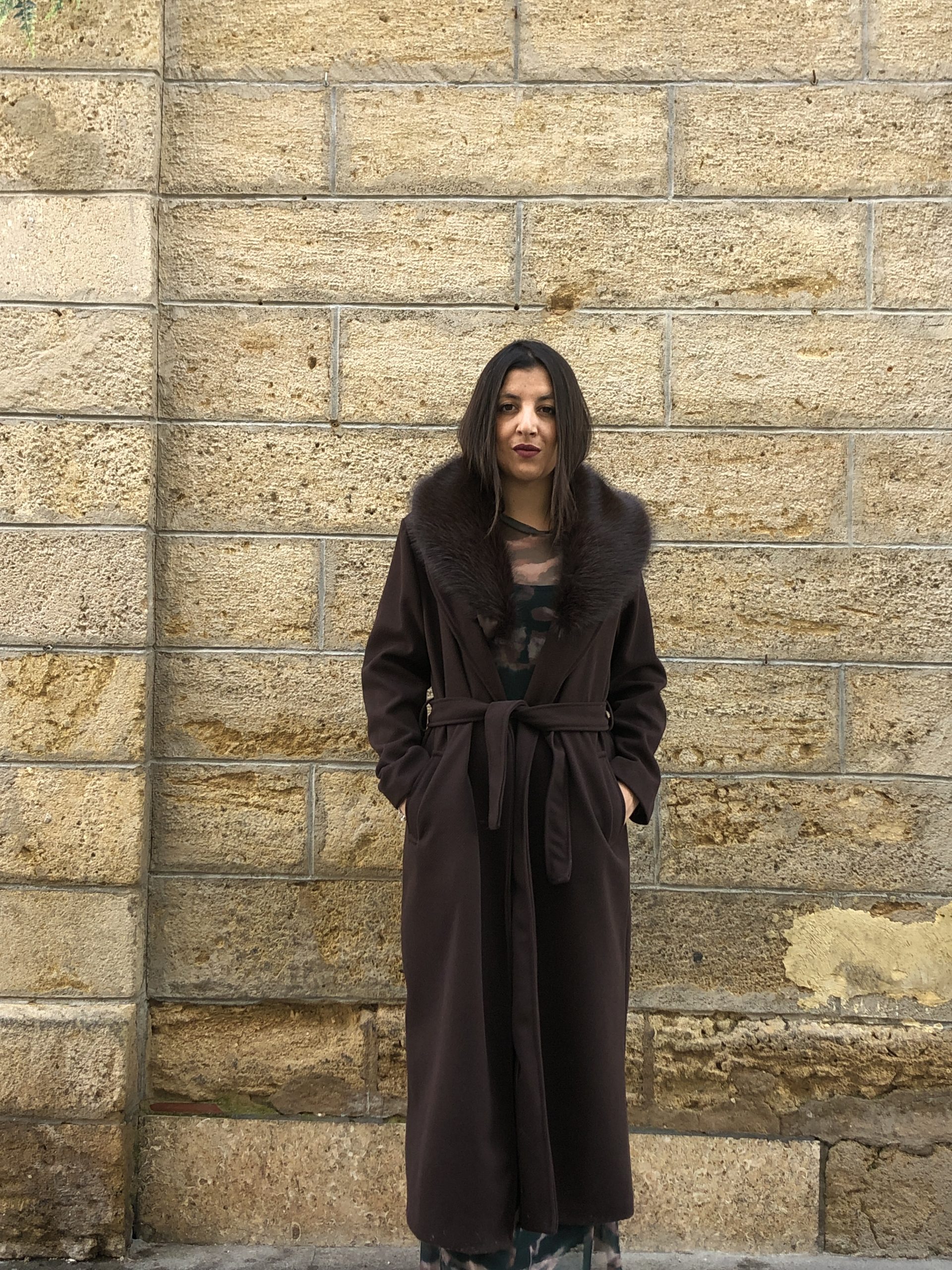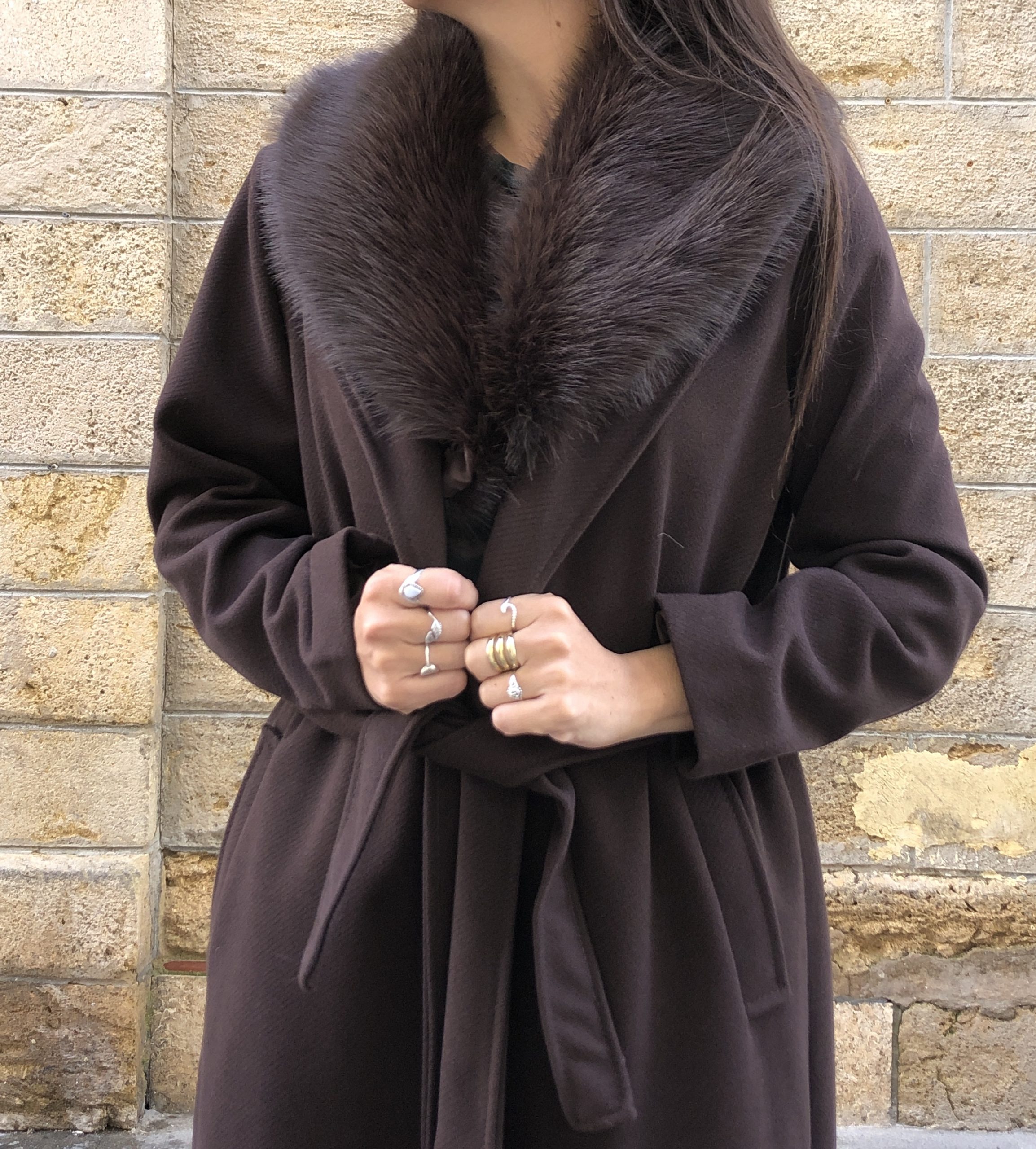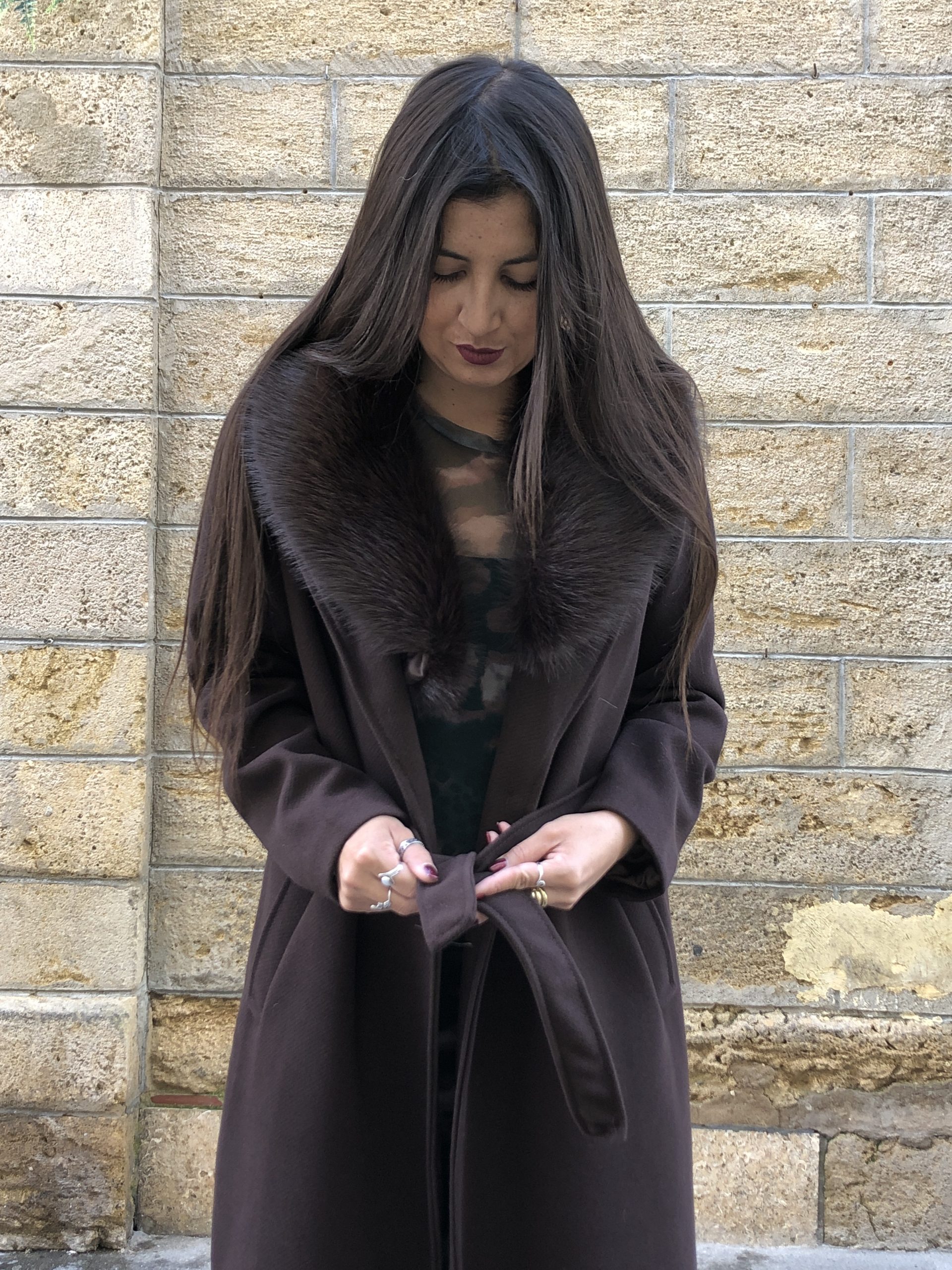 Abrigo largo en tono marrón chocolate con suave pelo en el cuello que aporta calidez y sofisticación. De silueta elegante y espíritu boho-chic, es una pieza envolvente y atemporal, ideal para elevar cualquier look invernal con un toque natural y refinado.