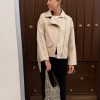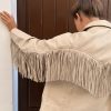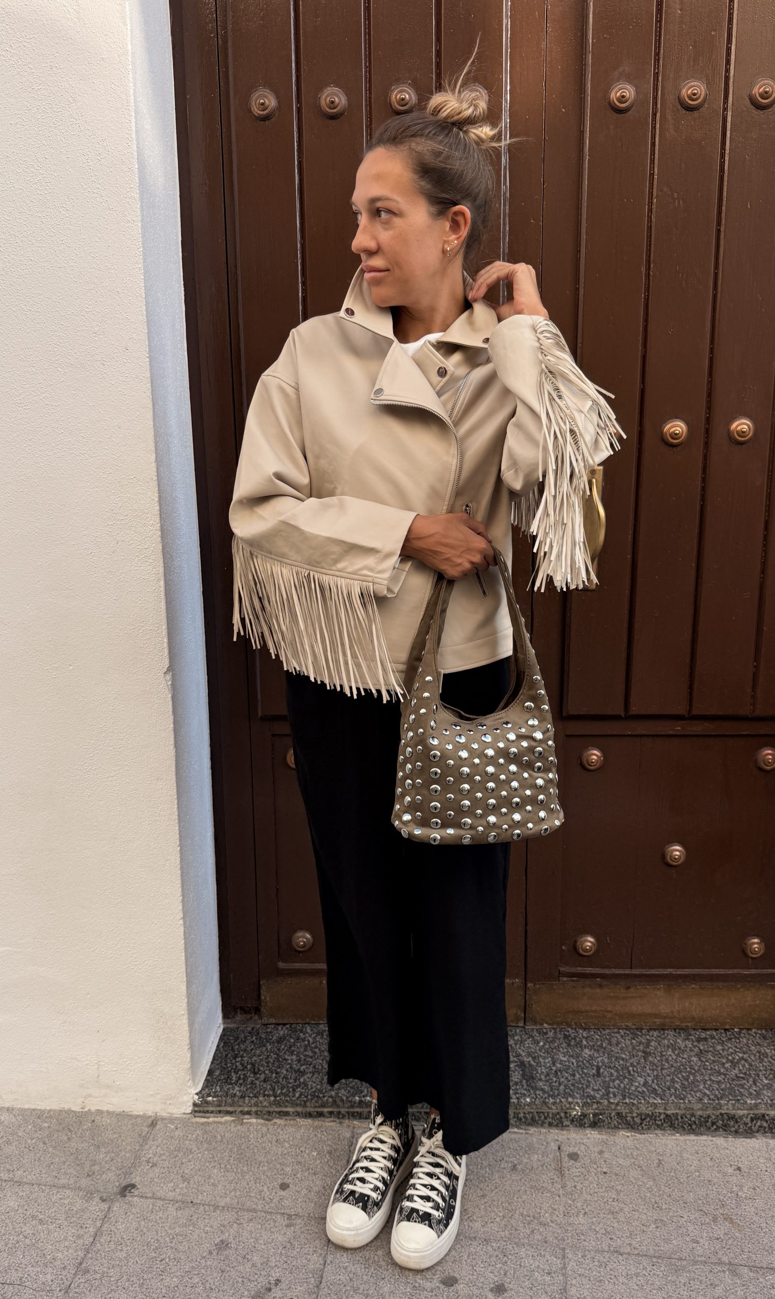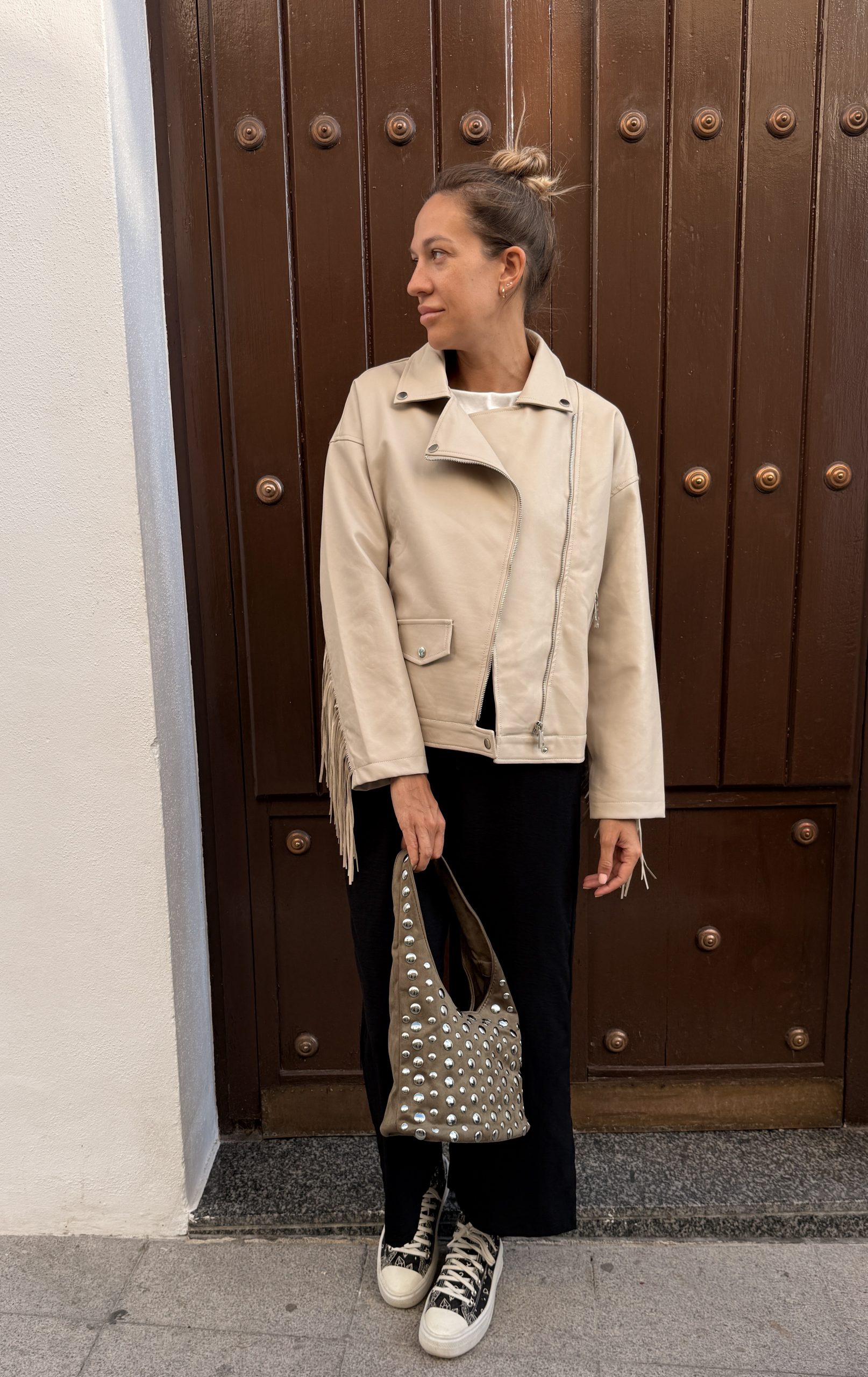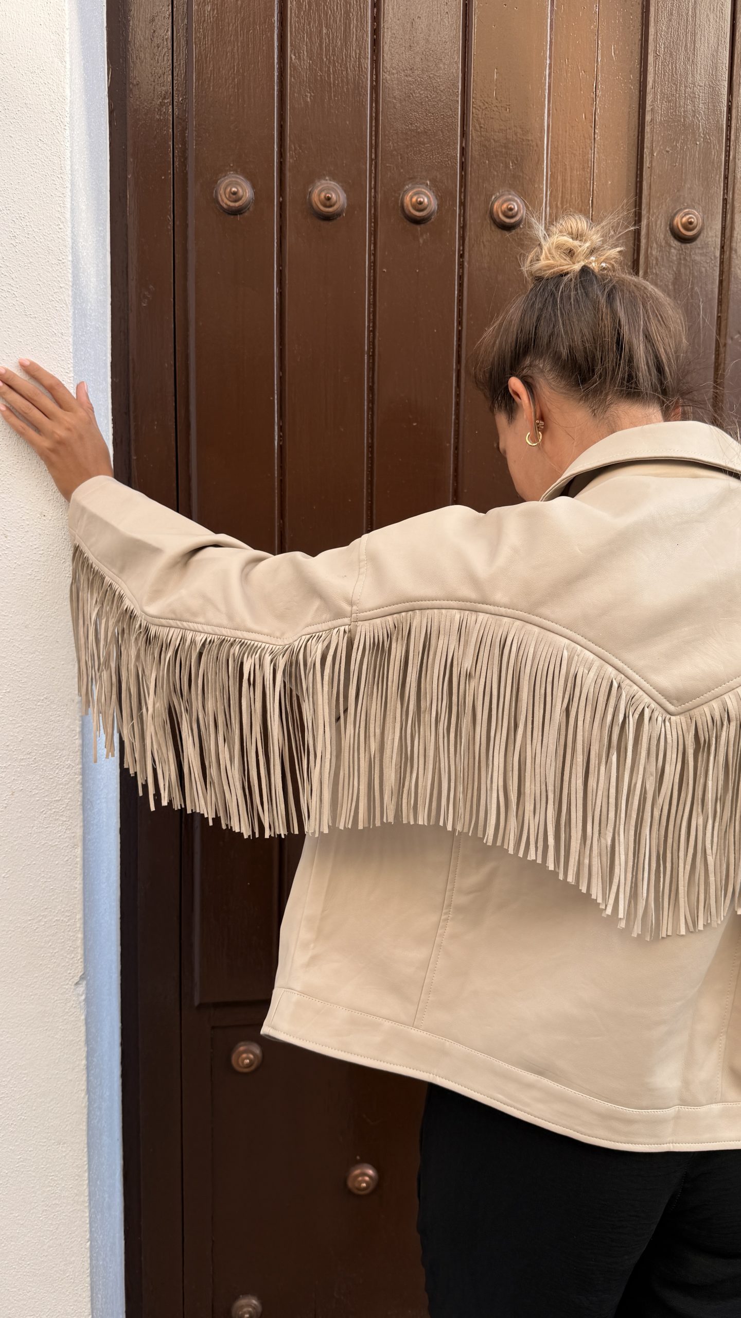 Chaqueta de cuero sintético en un elegante tono piedra, ideal para darle un toque moderno y sofisticado a cualquier look. El diseño destaca por sus mangas y espalda adornadas con flecos, que aportan movimiento y un estilo bohemio chic. Perfecta para combinar con jeans, vestidos o faldas y llevar tanto de día como de noche.
