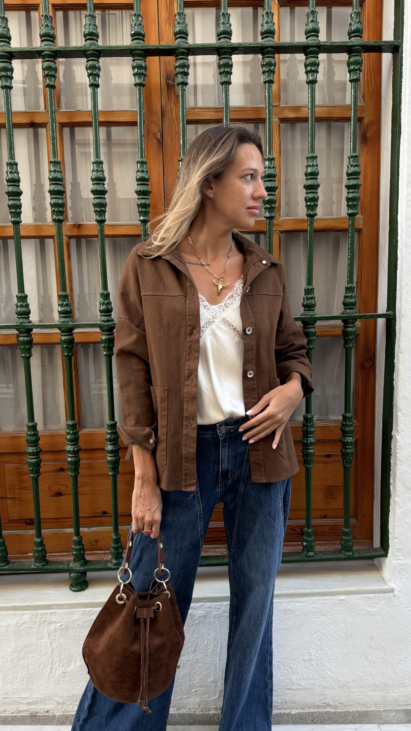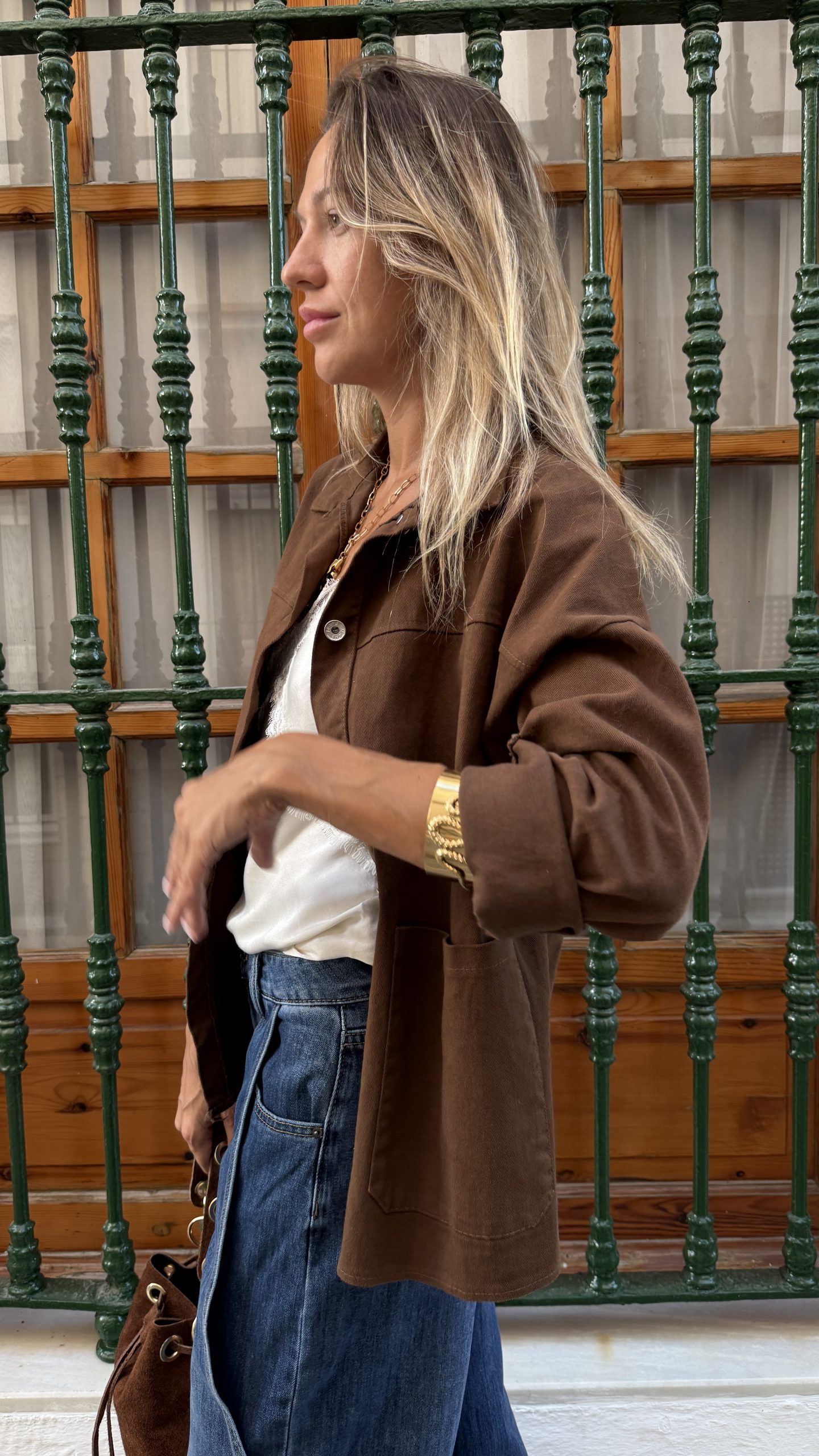 Chaqueta vaquera en color chocolate, perfecta para un look casual y relajado. De corte clásico, con botones al frente y bolsillos estilo utilitario, combina estilo y comodidad sin esfuerzo. El tono marrón chocolate le da un toque original al denim de siempre, ideal para usar con jeans, faldas o vestidos. Fácil de llevar, fácil de combinar — una prenda versátil para todos los días.