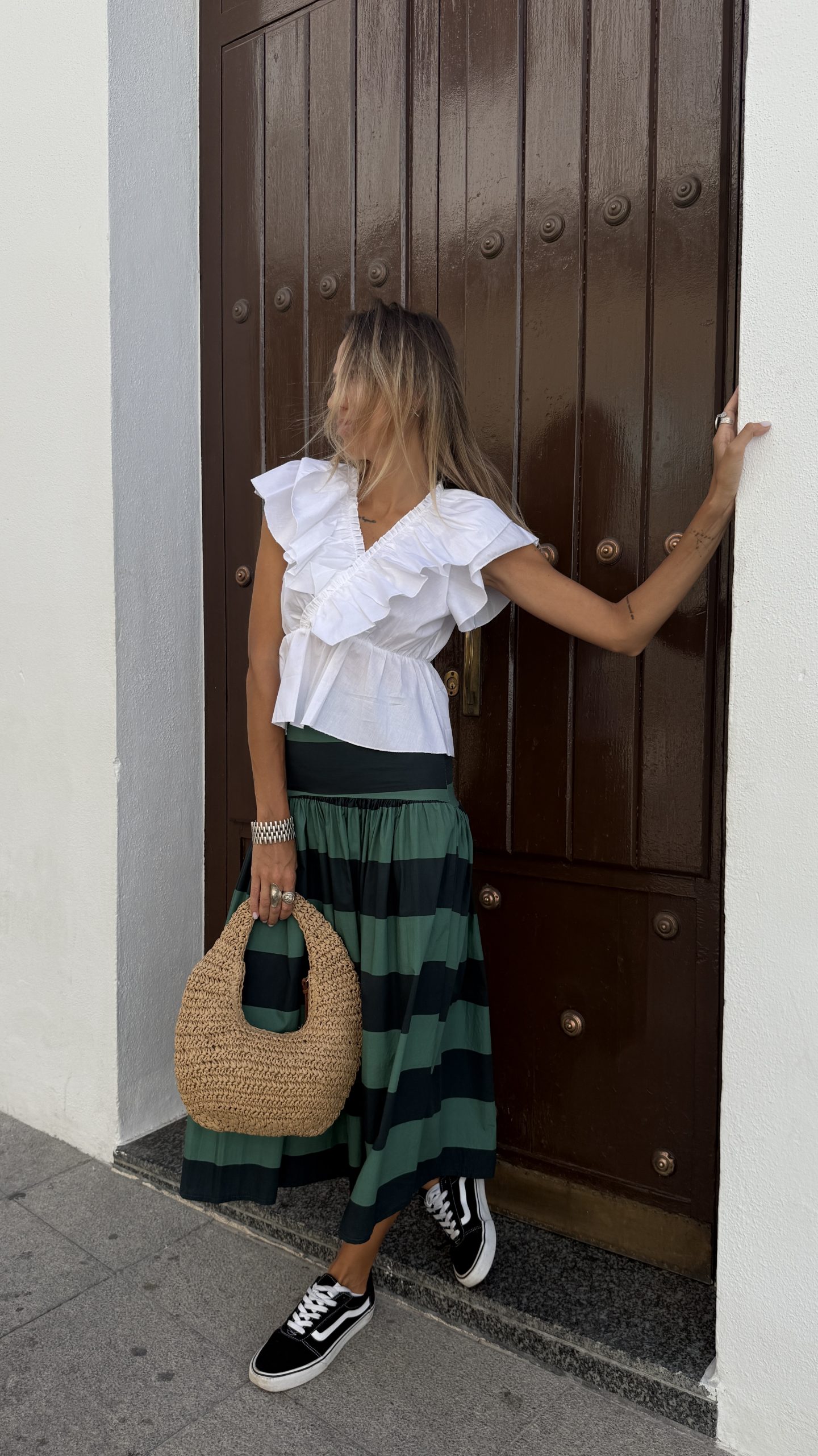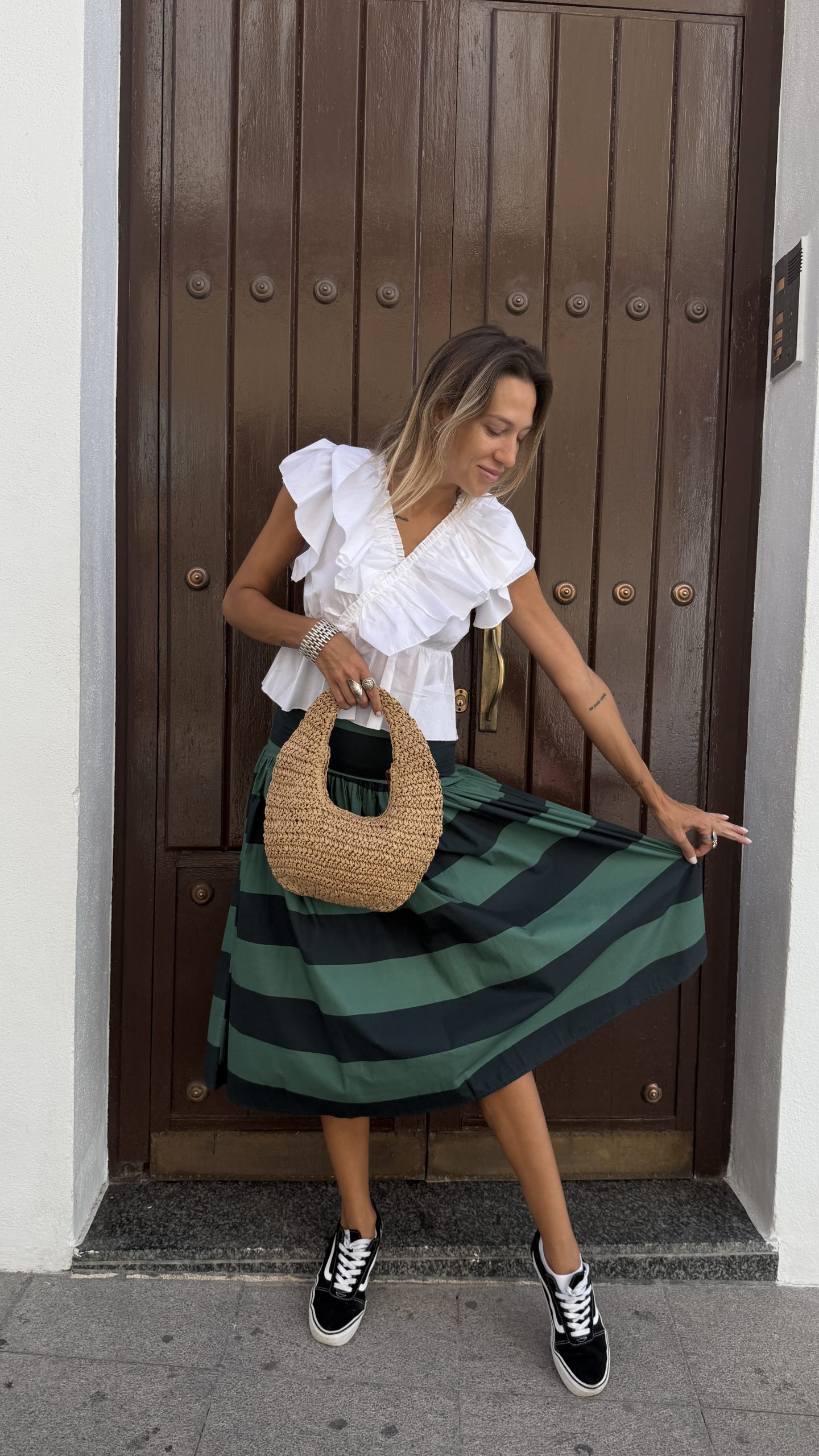 Esta falda larga en tono verde con delicadas rayas es una pieza única que combina elegancia con un toque moderno y cuqui. Su cintura baja añade un aire relajado pero sofisticado, ideal para quienes buscan destacar con un estilo original y sin esfuerzo. Confeccionada en un tejido ligero y fluido, se mueve con gracia, aportando frescura y comodidad en cada paso.