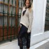 Femenina y sofisticada, esta falda de encaje azul combina delicadas transparencias con una base de raso suave y brillante. Su diseño resalta la silueta con elegancia y sensualidad, ideal para looks de noche o eventos especiales.