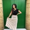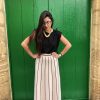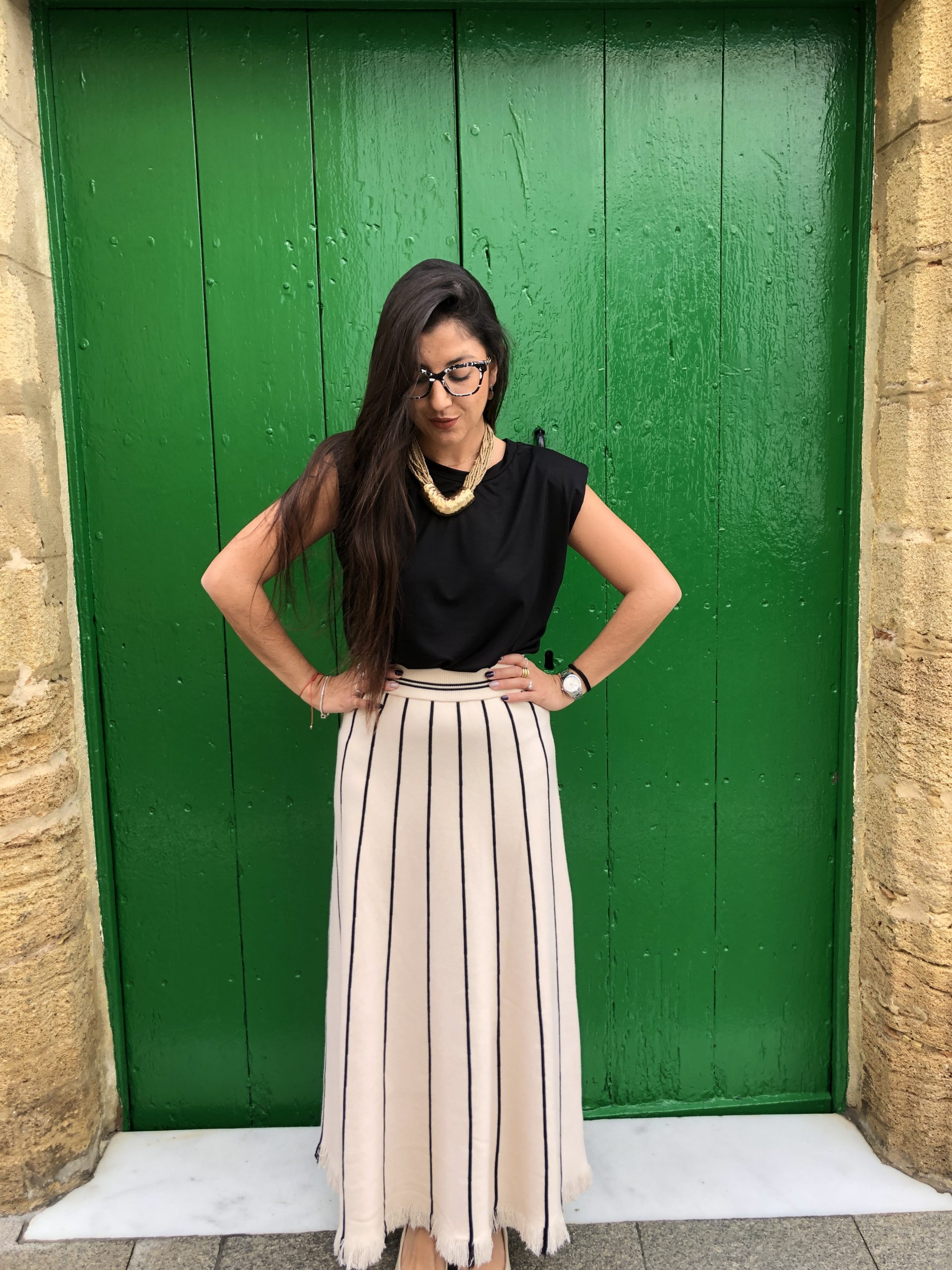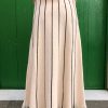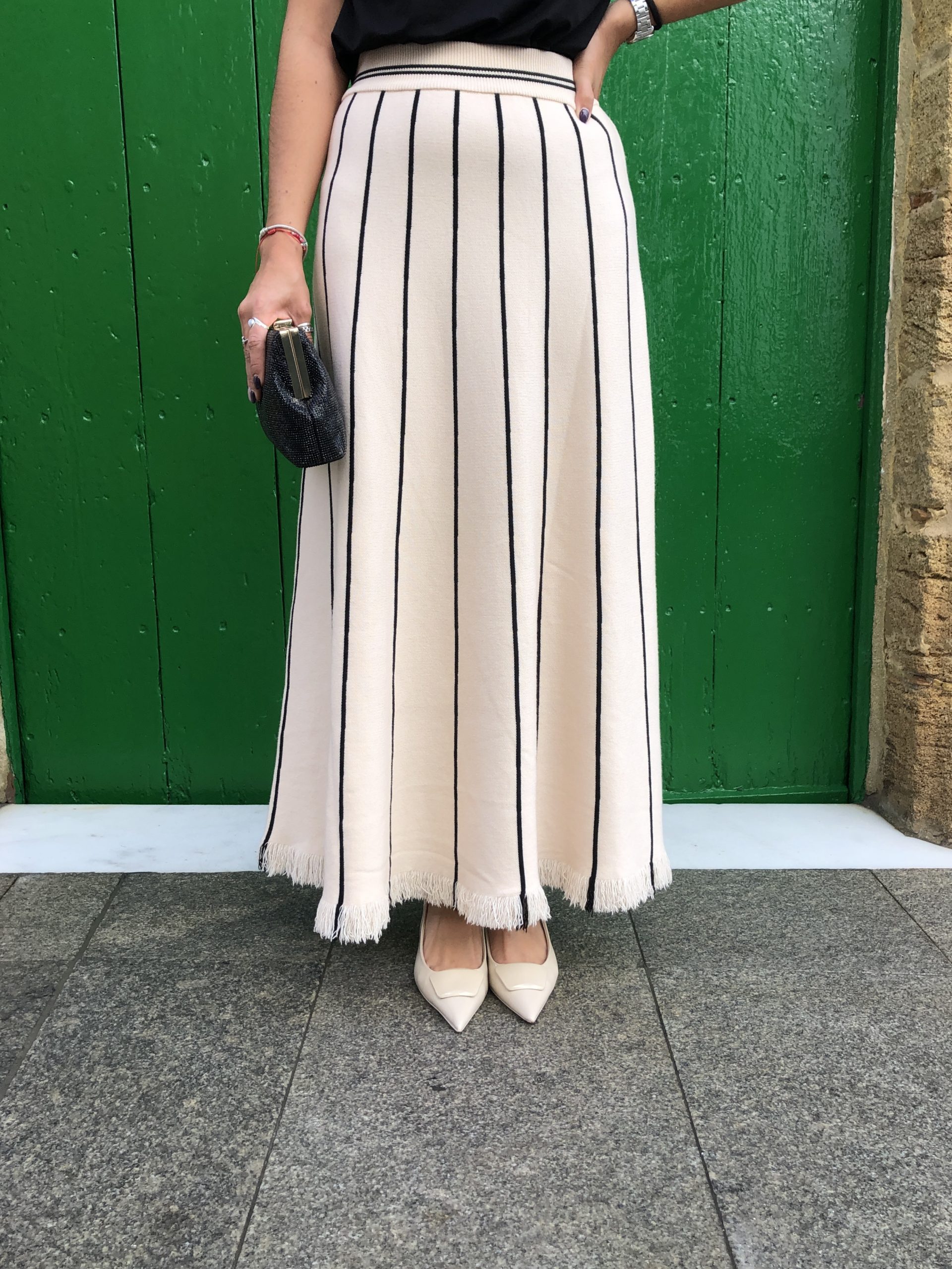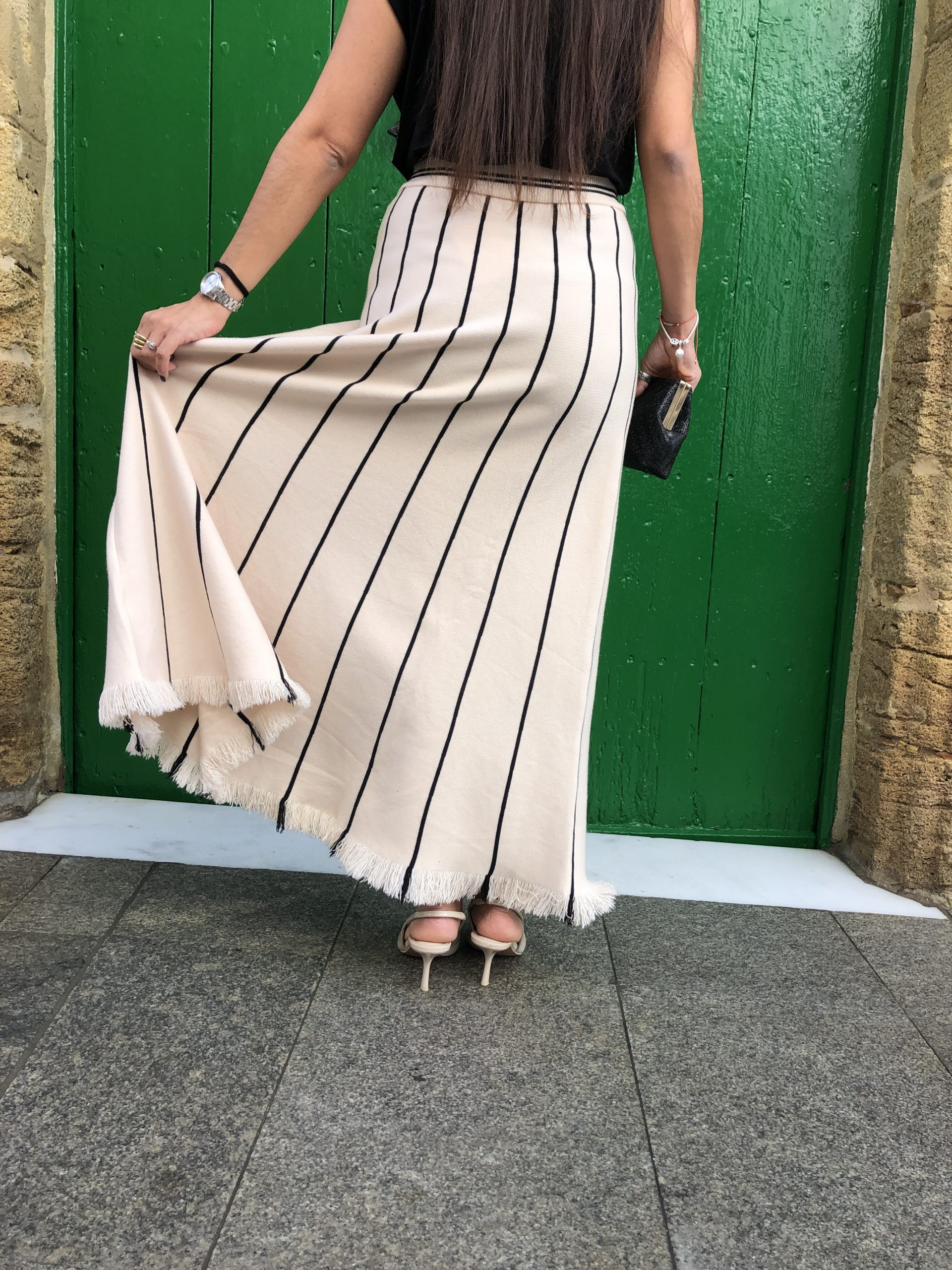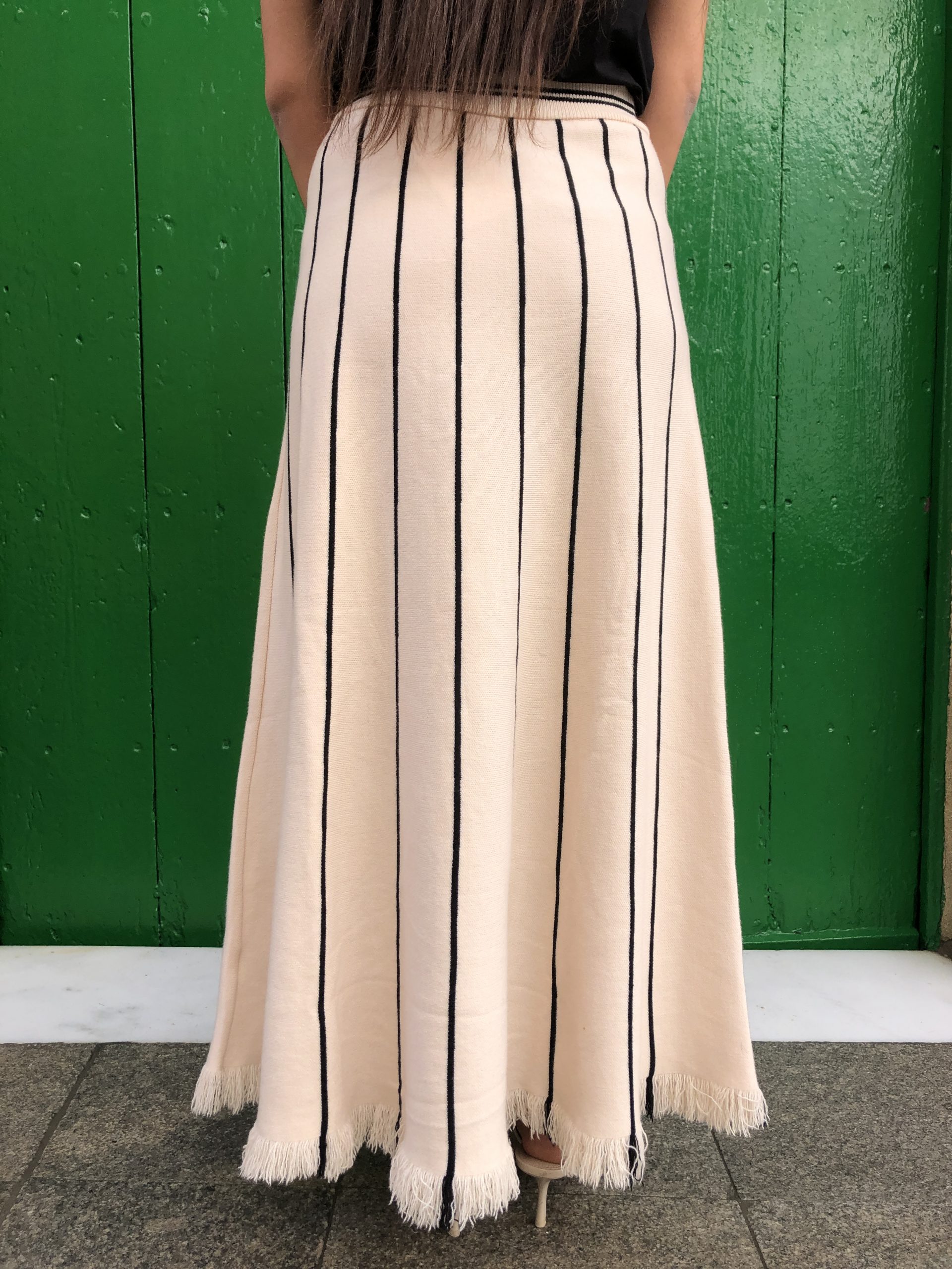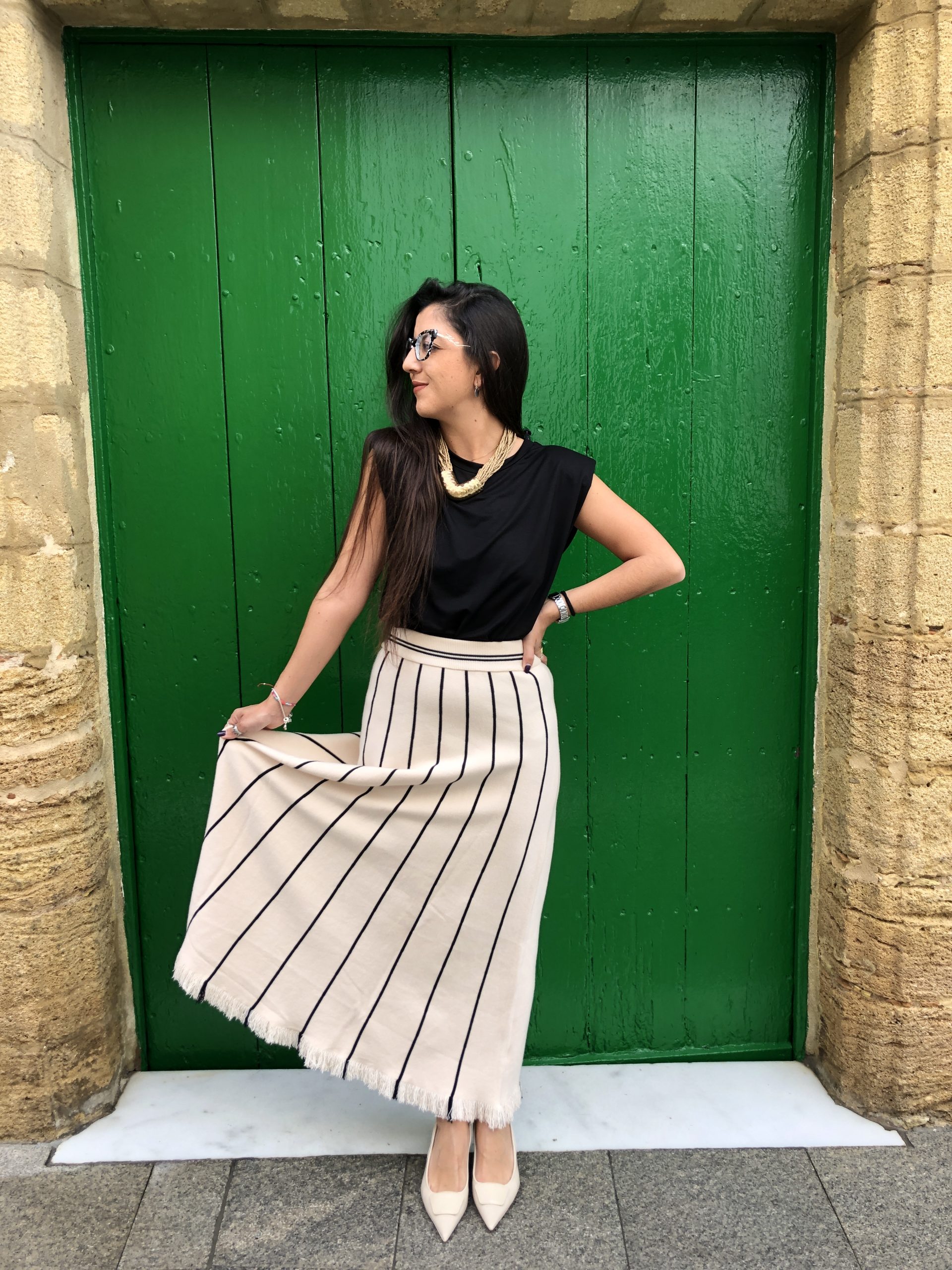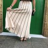 Esta falda beige con líneas verticales negras destaca por su elegancia discreta y su diseño estilizador. El contraste entre el tono neutro y las líneas definidas aporta profundidad y una sensación de verticalidad que alarga visualmente la silueta. Su tejido suave y estructurado ofrece comodidad sin perder forma, convirtiéndola en una prenda versátil y refinada. Perfecta para looks tanto formales como casuales, añade un toque moderno y minimalista a cualquier conjunto.