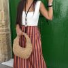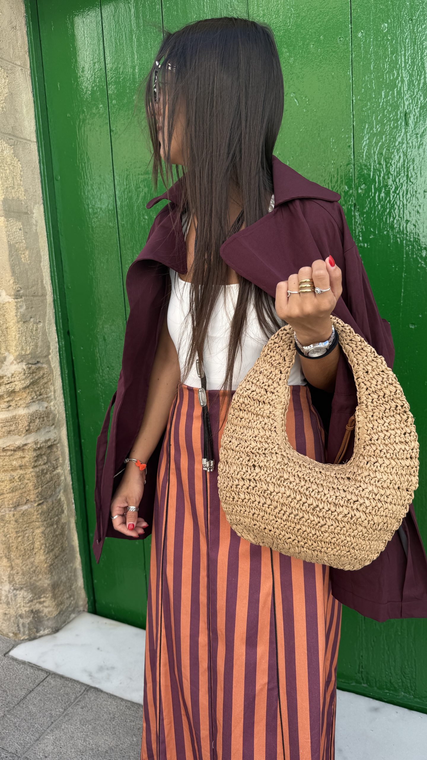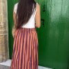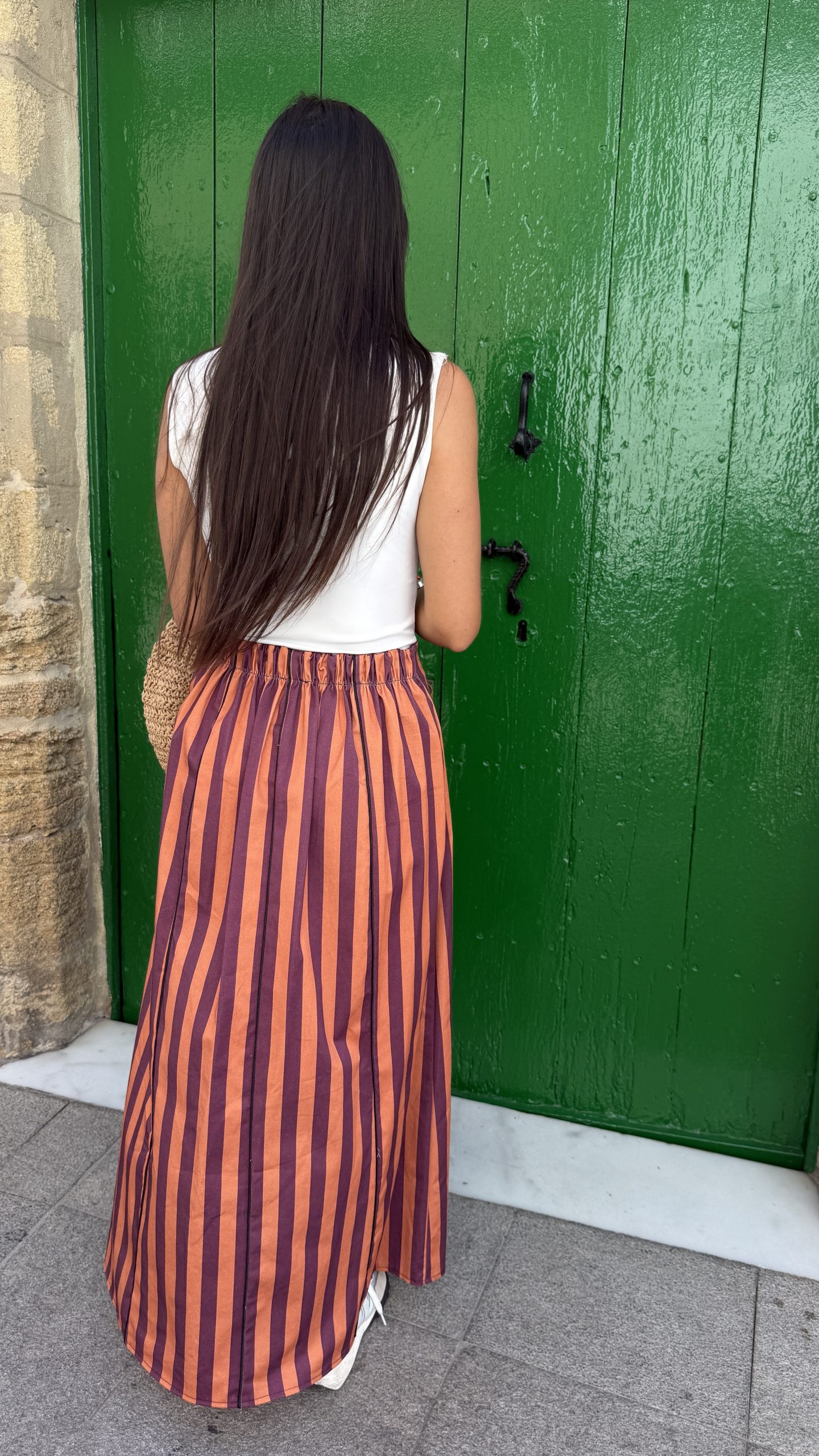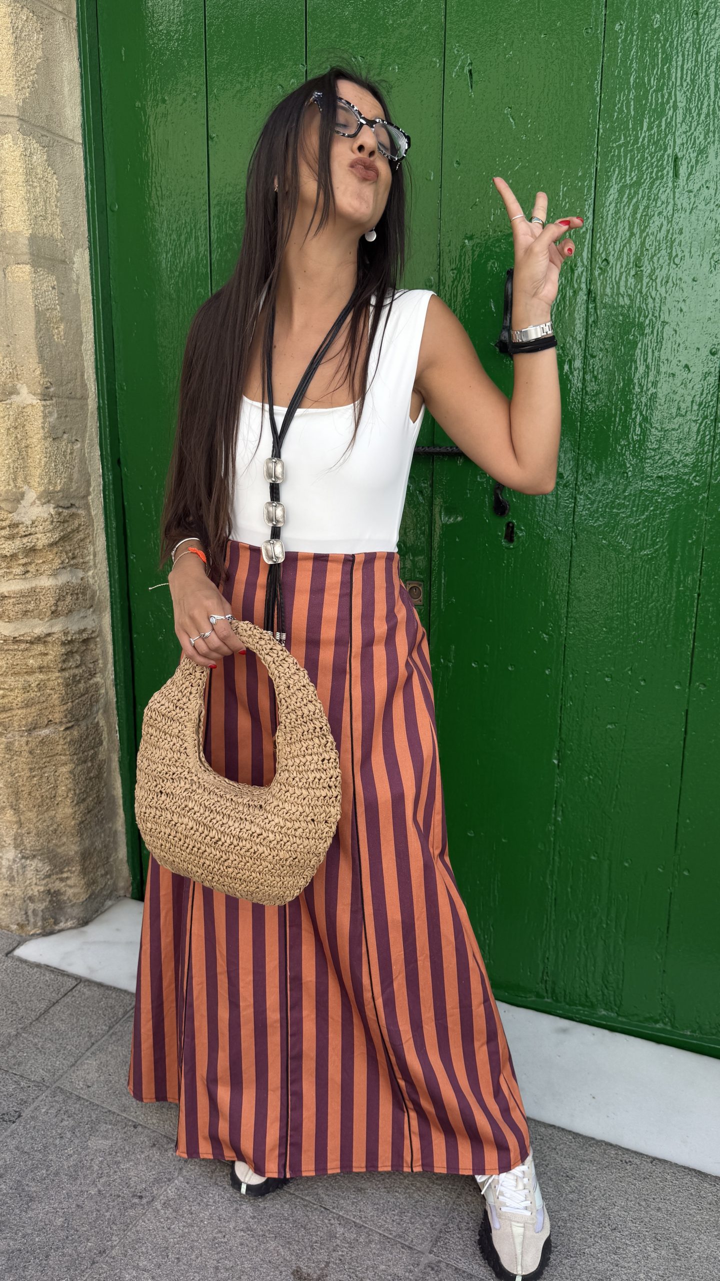 Esta falda midi estilo lápiz en mezclilla se reinventa con un elegante estampado de rayas, aportando un toque gráfico y moderno a una silueta clásica. Su corte ajustado realza la figura, mientras que la longitud midi añade sofisticación y versatilidad.