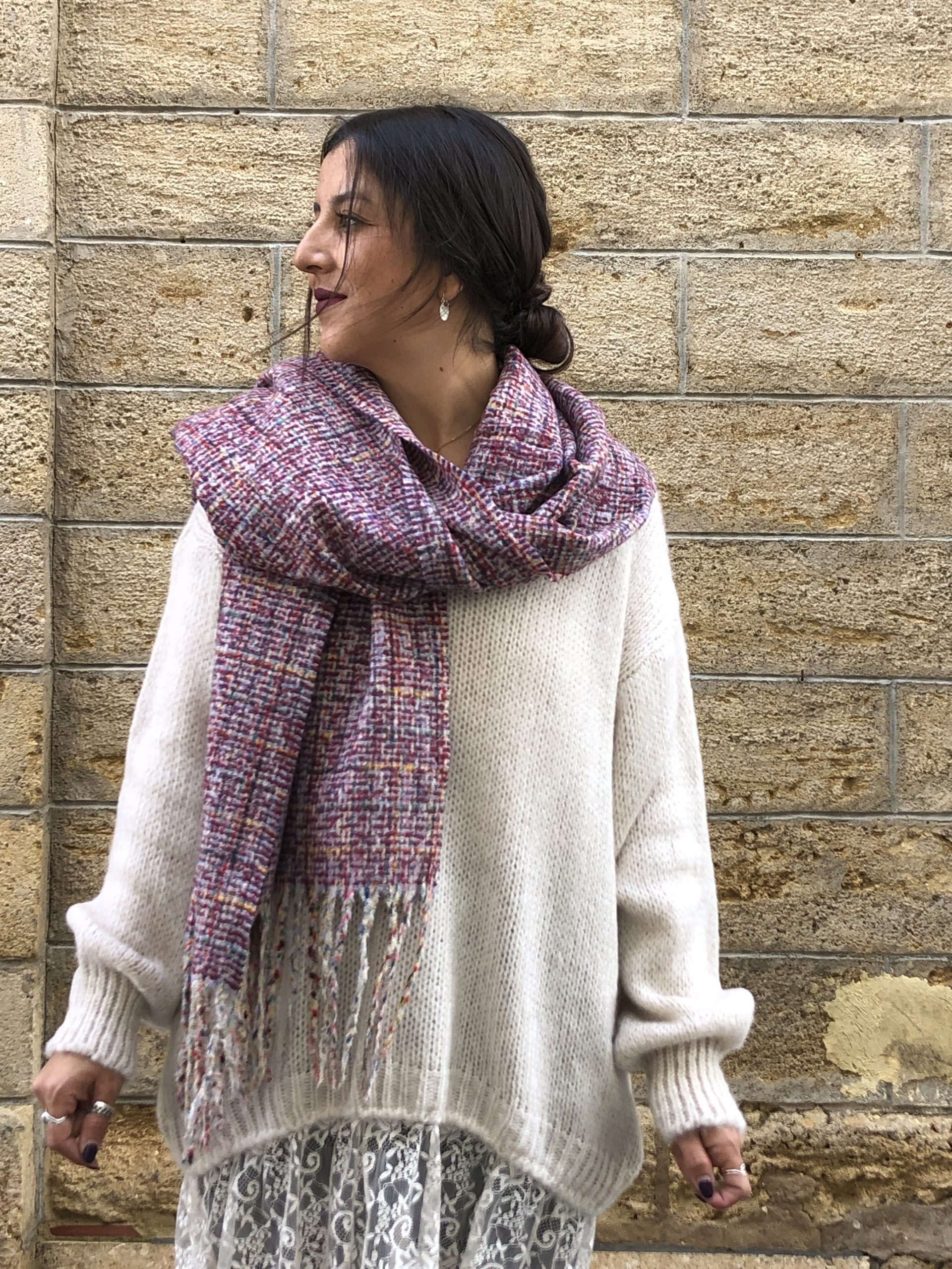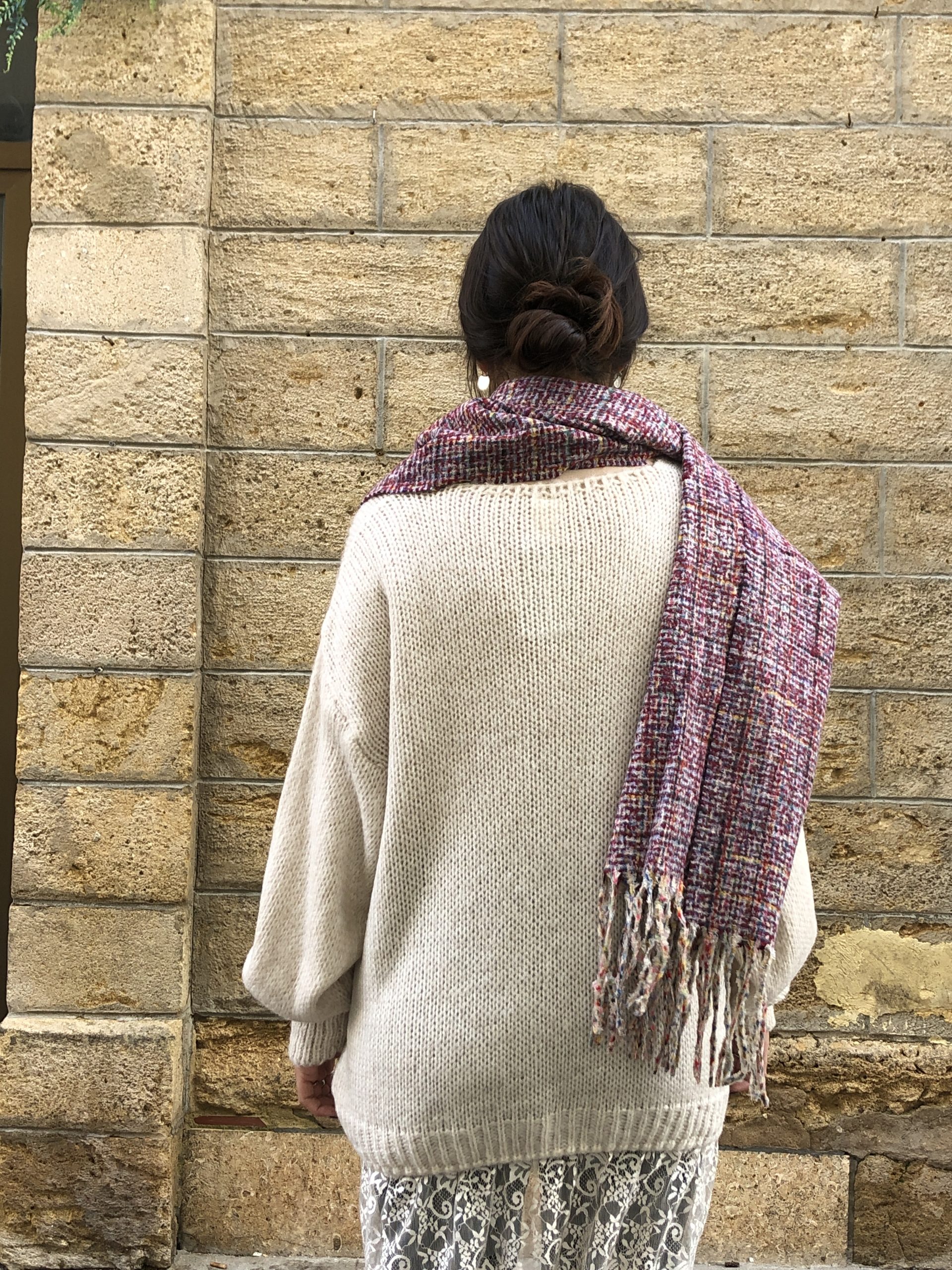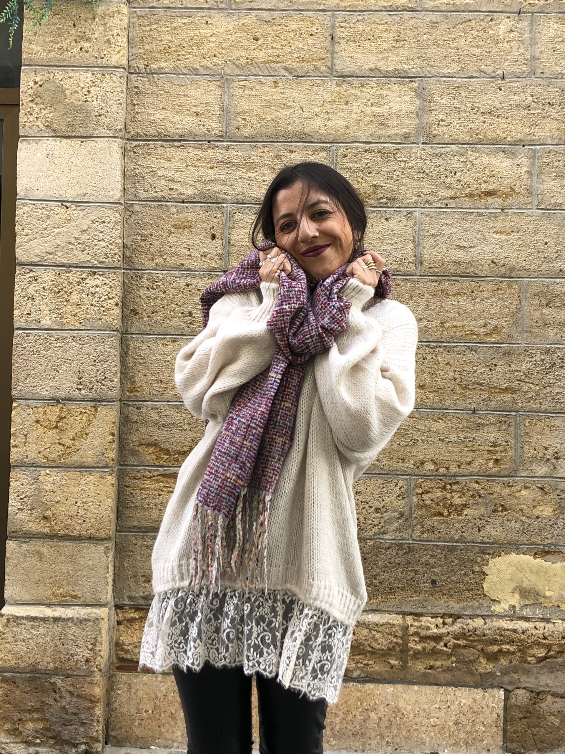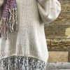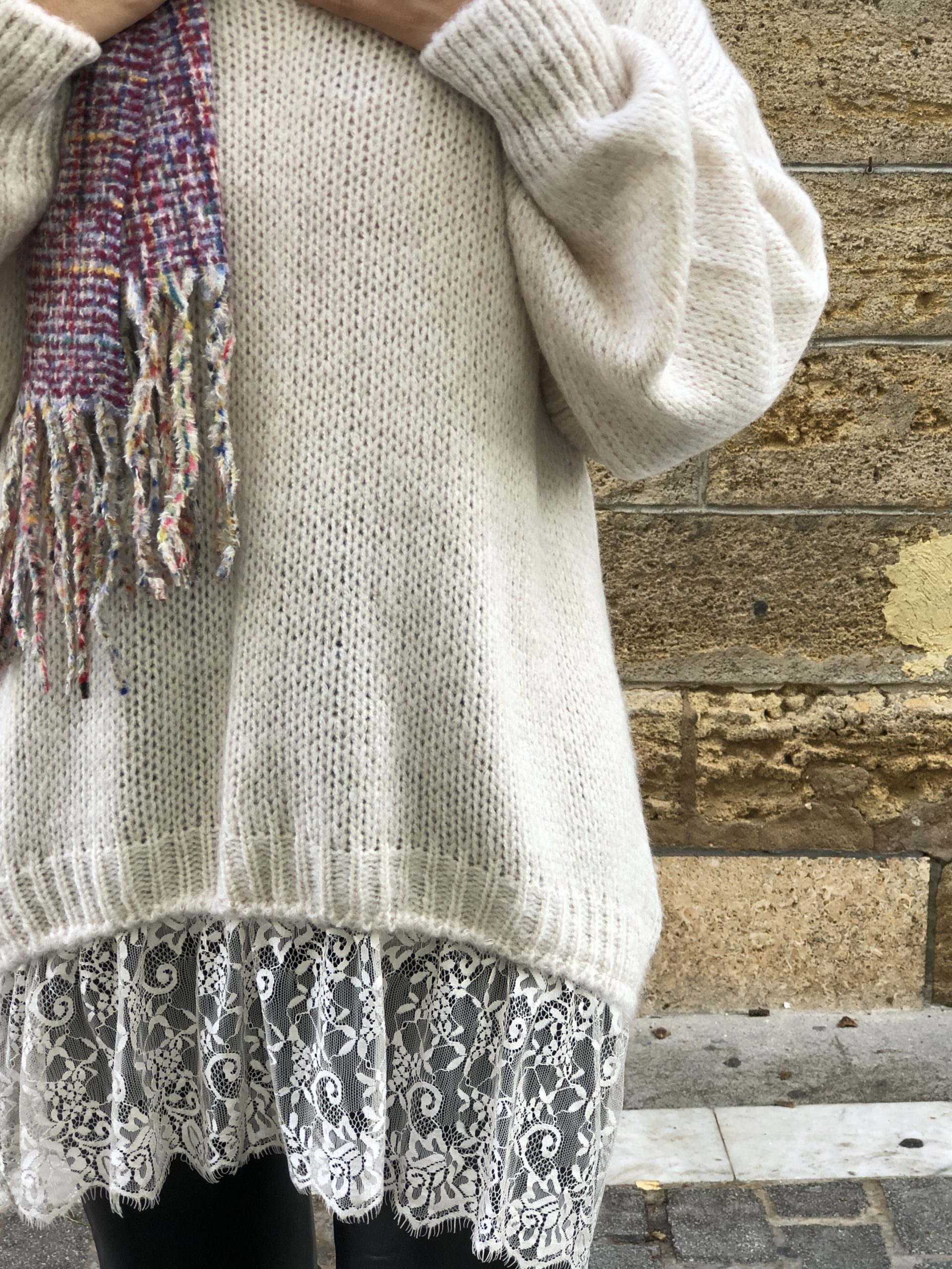 - Sutil y femenino, este jersey beige con acabado de encaje combina la calidez del punto con la delicadeza del encaje.