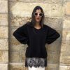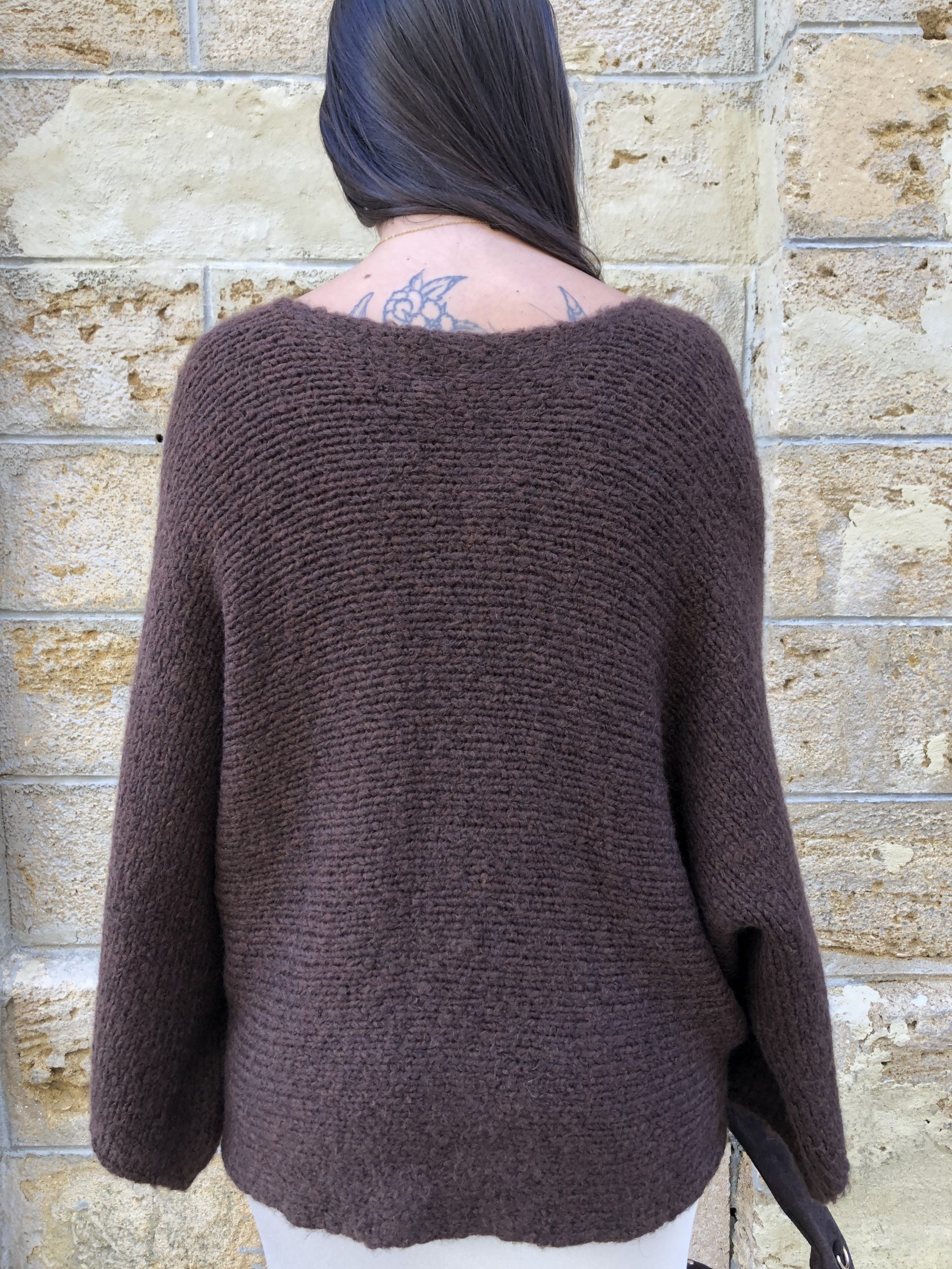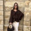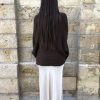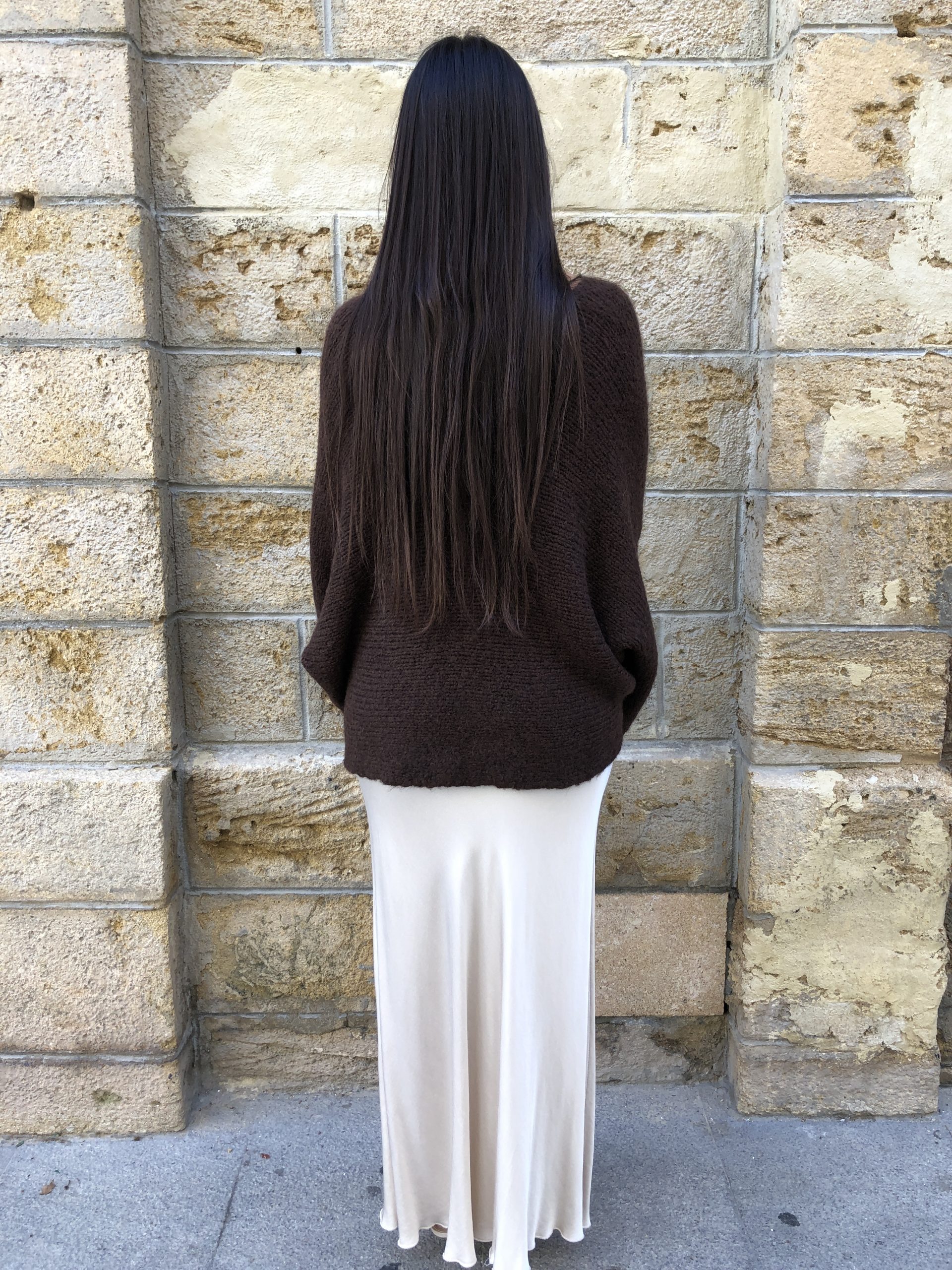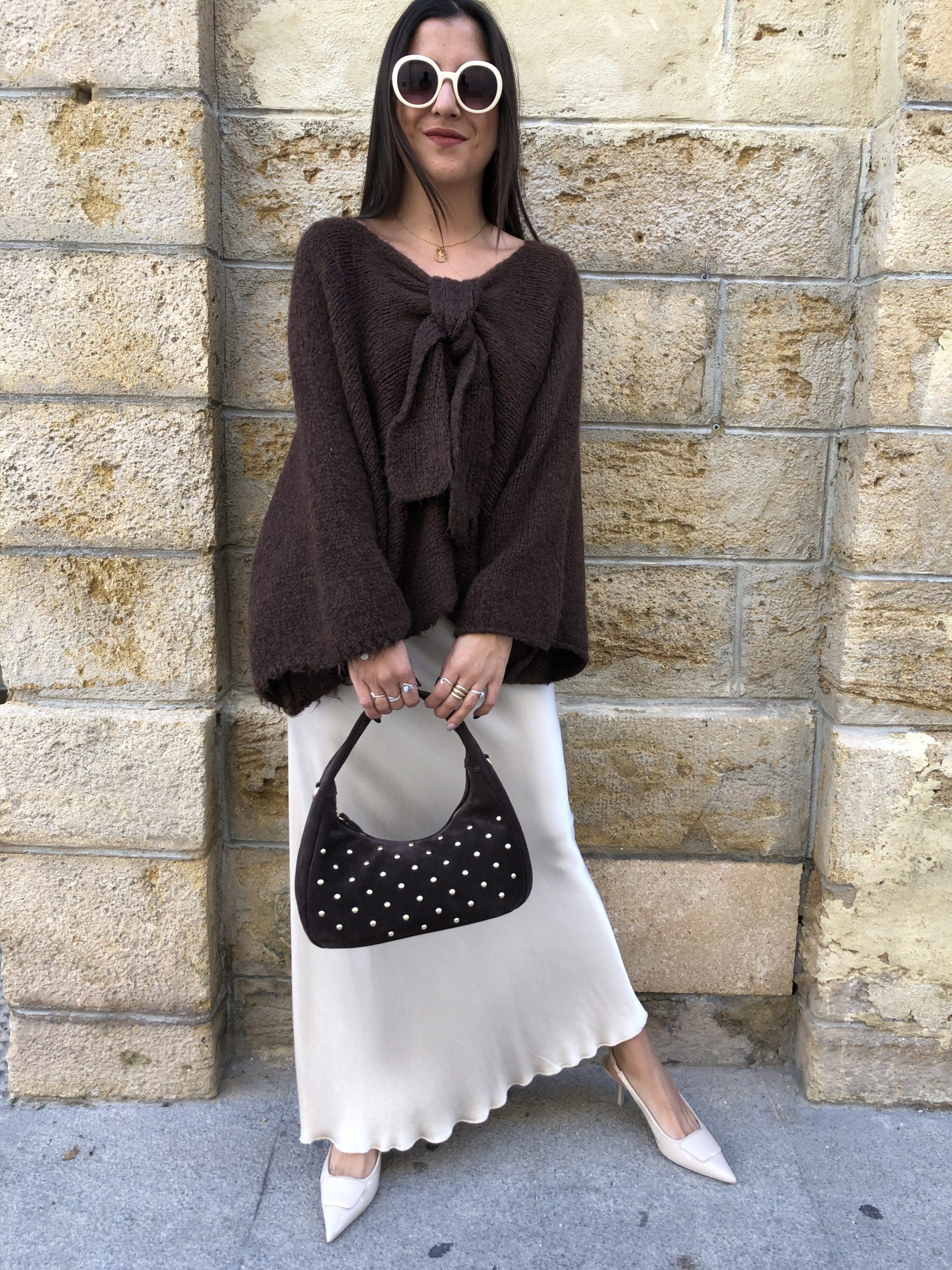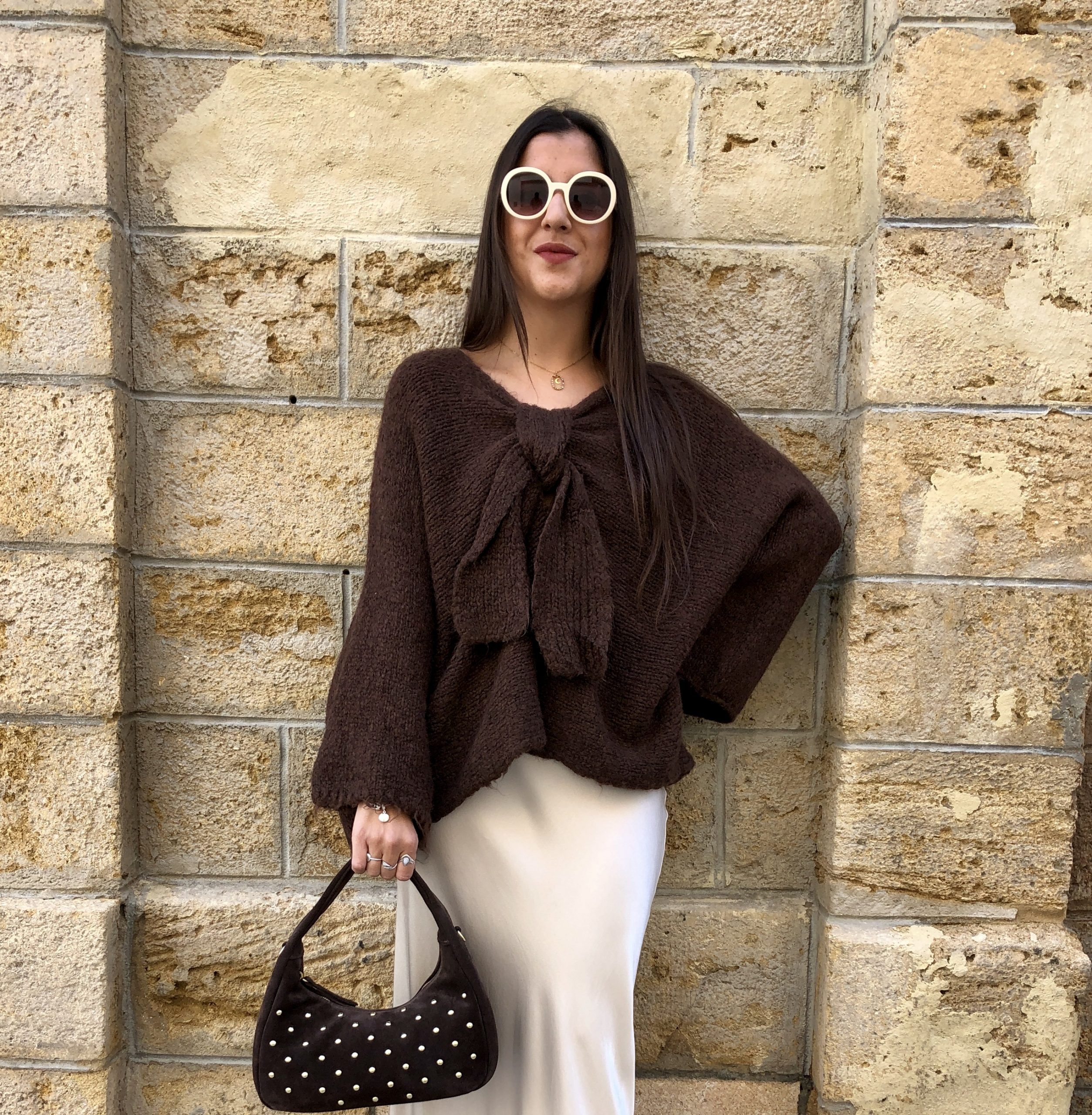 Este jersey en tono marrón chocolate sienta especialmente bien gracias a su silueta amplia y relajada. El color, profundo y envolvente, aporta calidez y sofisticación, mientras que el corte holgado cae con naturalidad sin marcar el cuerpo. El detalle del lazo en la parte delantera añade un toque delicado y femenino que equilibra su aire desenfadado, convirtiéndolo en una prenda cómoda, estilizada y con mucho encanto.