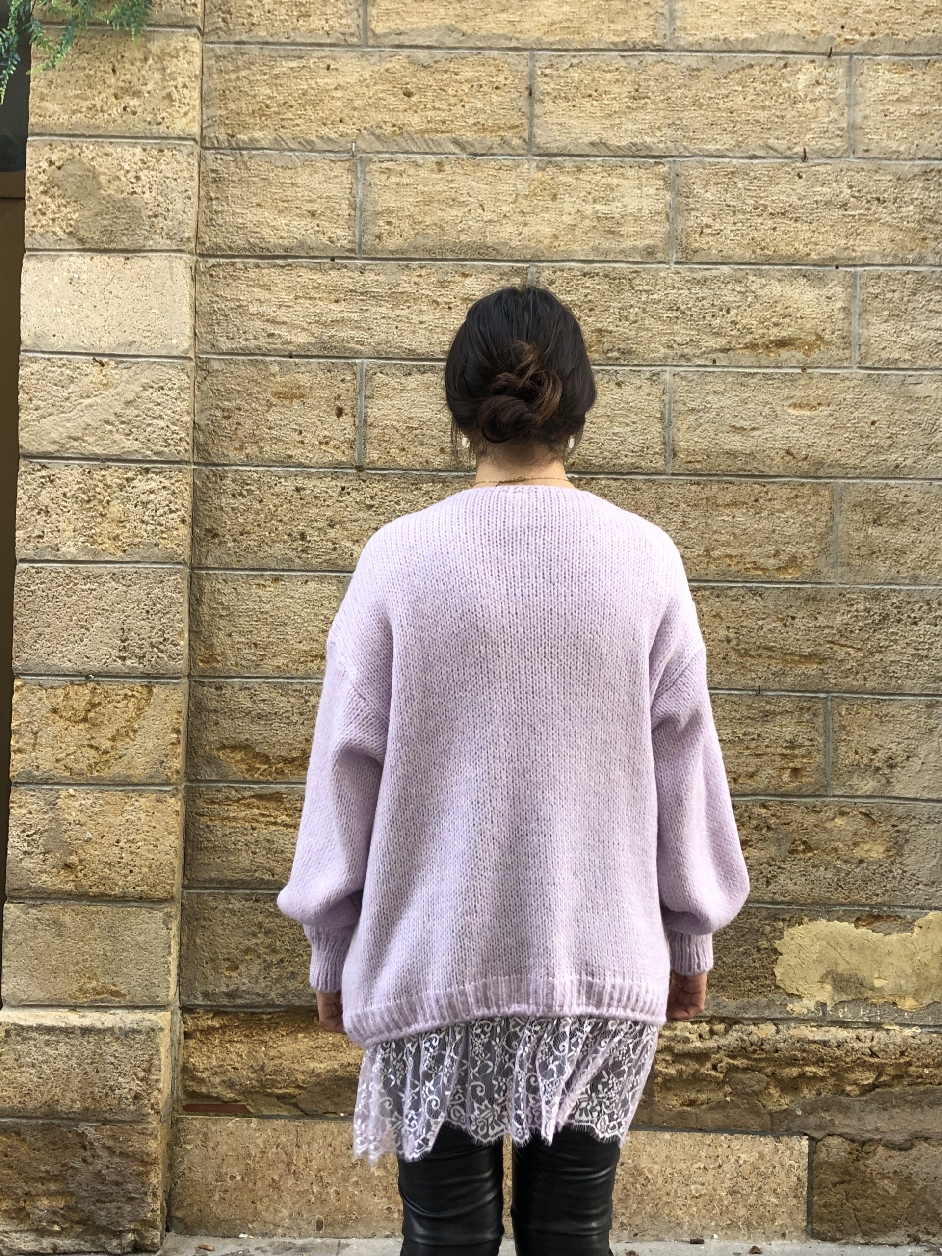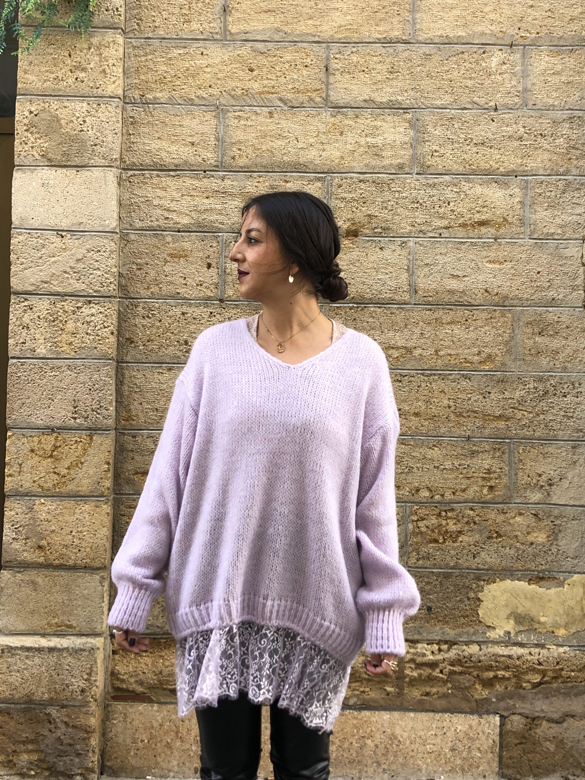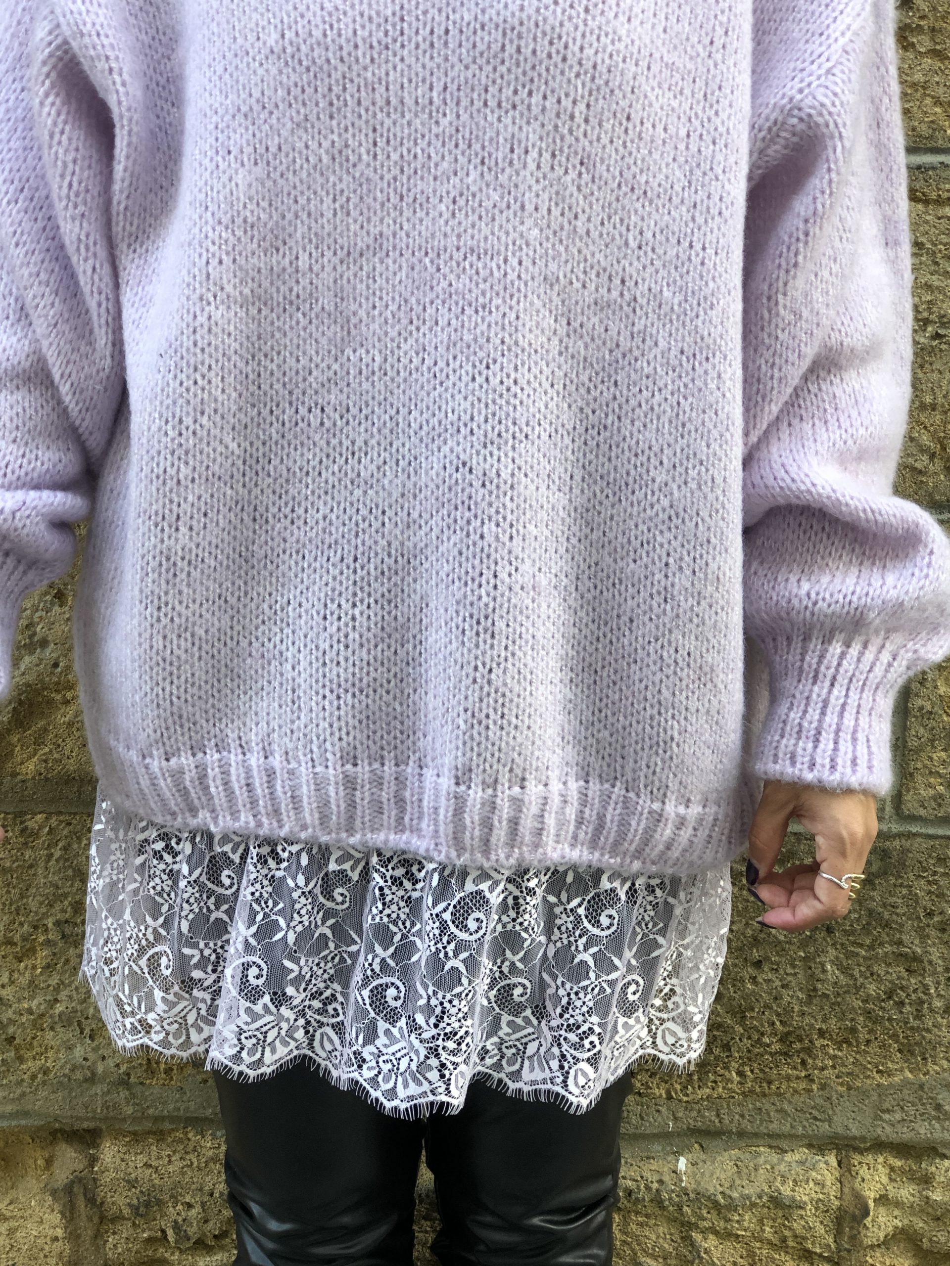 Sutil y femenino, este jersey lila con acabado de encaje combina la calidez del punto con la delicadeza del encaje.
