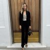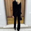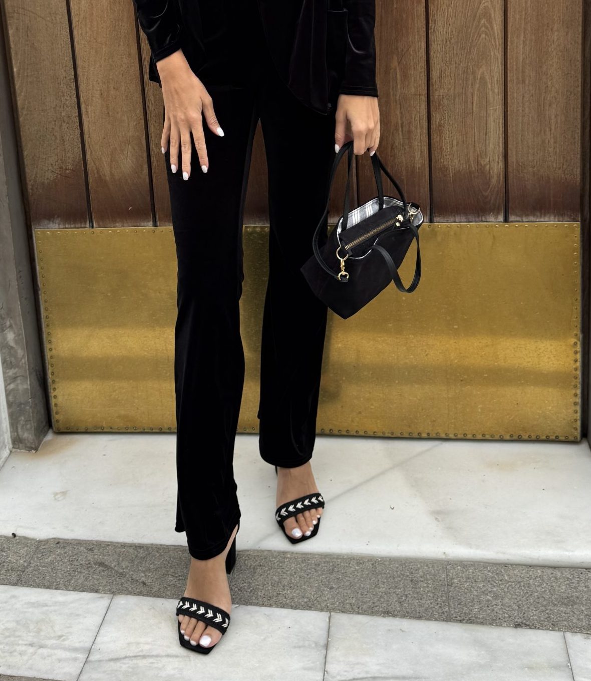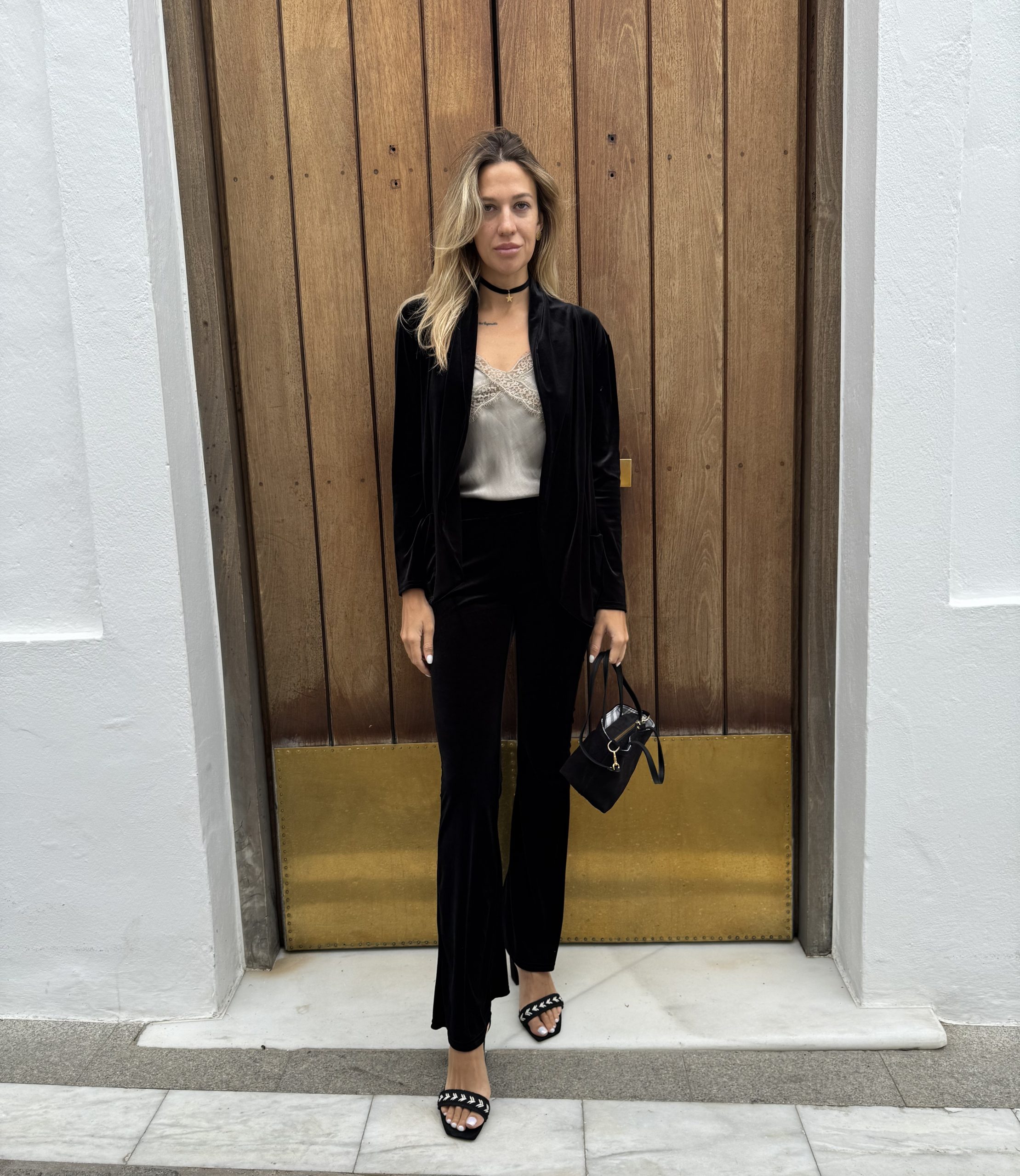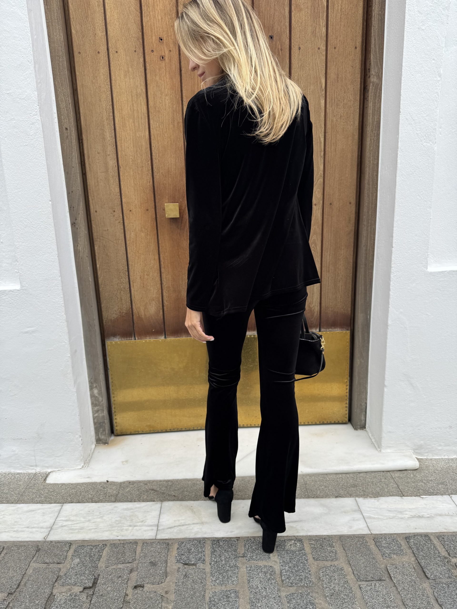 El pantalón de campana de terciopelo negro es una prenda icónica que evoca un aire de glamour y sofisticación atemporal. El terciopelo, con su textura suave y lustrosa, aporta un brillo sutil que capta la luz de manera encantadora, convirtiendo este pantalón en una opción perfecta tanto para ocasiones casuales como para eventos más formales.