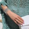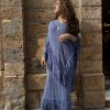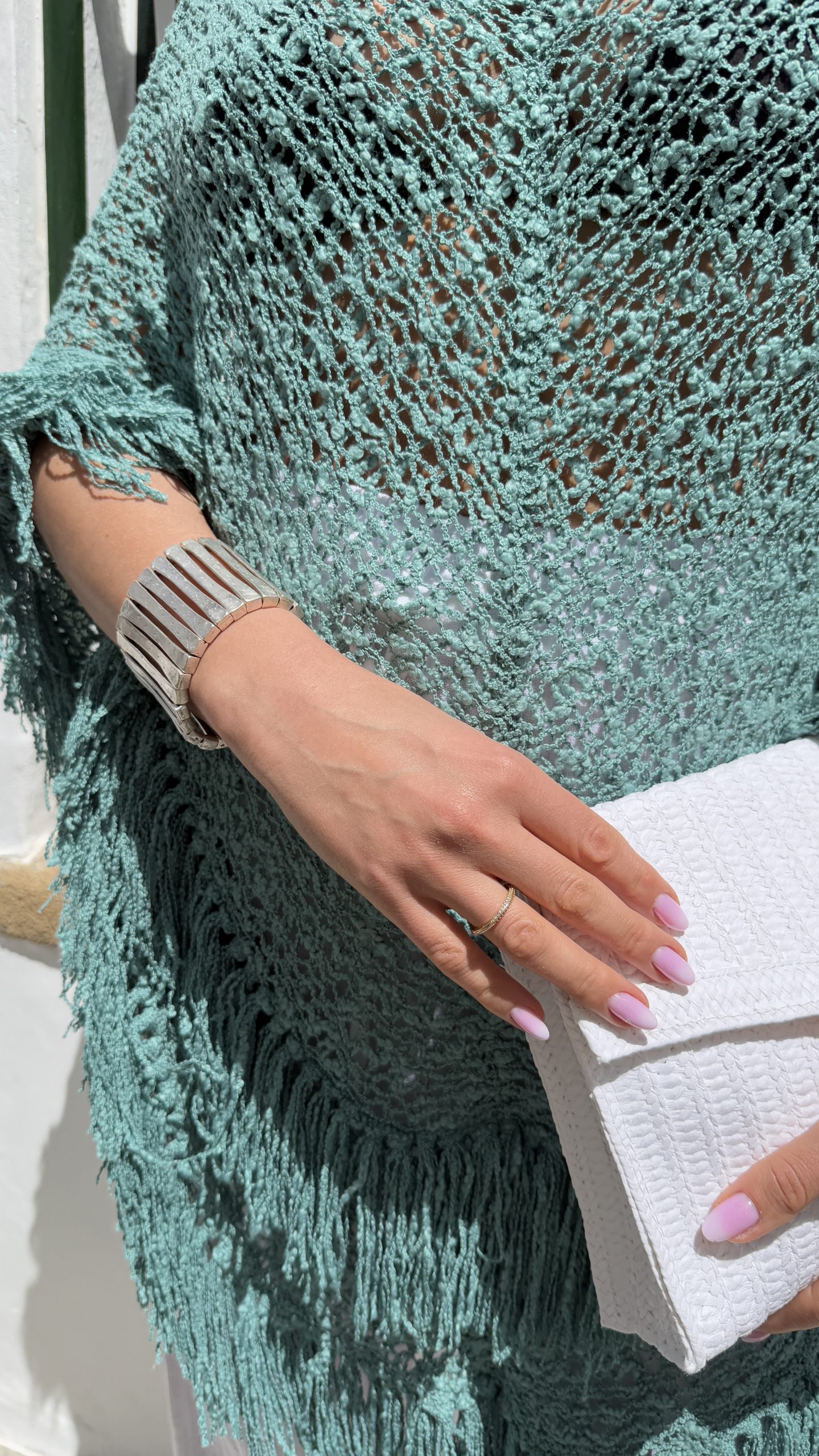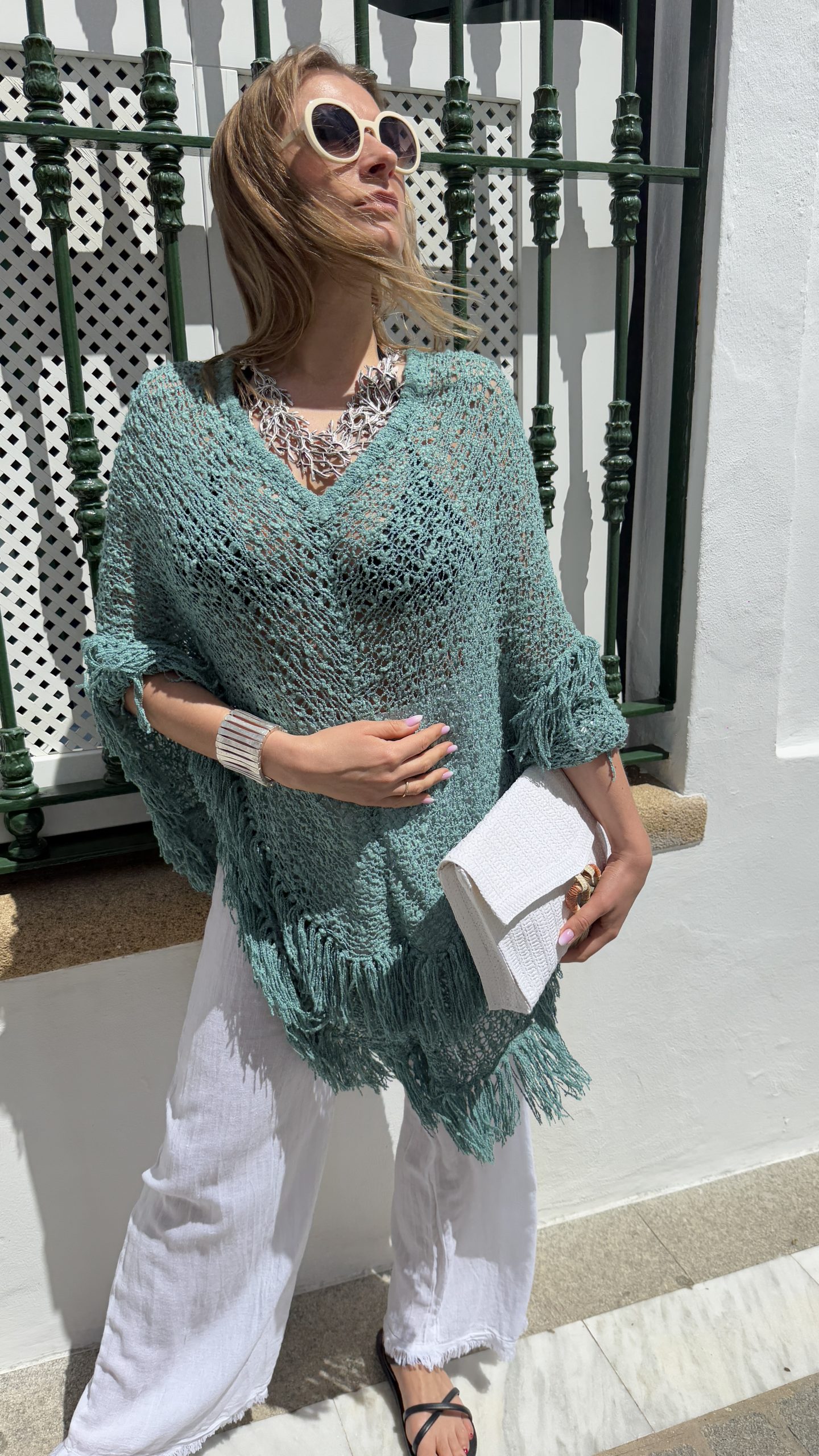 Poncho de primavera asimétrico con volantes de flecos de la firma de moda de Ibiza. Pieza multi posición con varias formas de llevarlo. Se puede poner un hombro totalmente al aire.