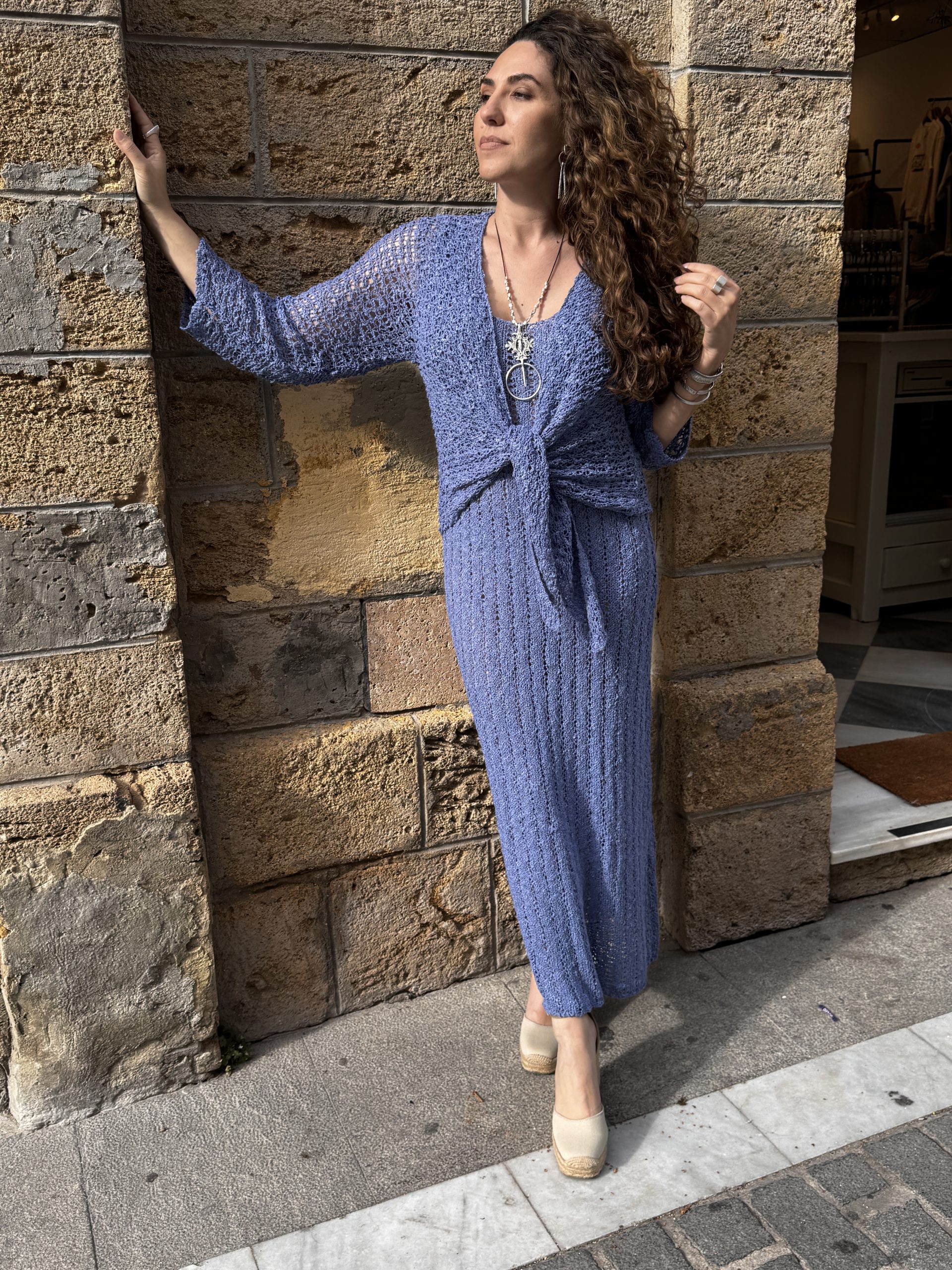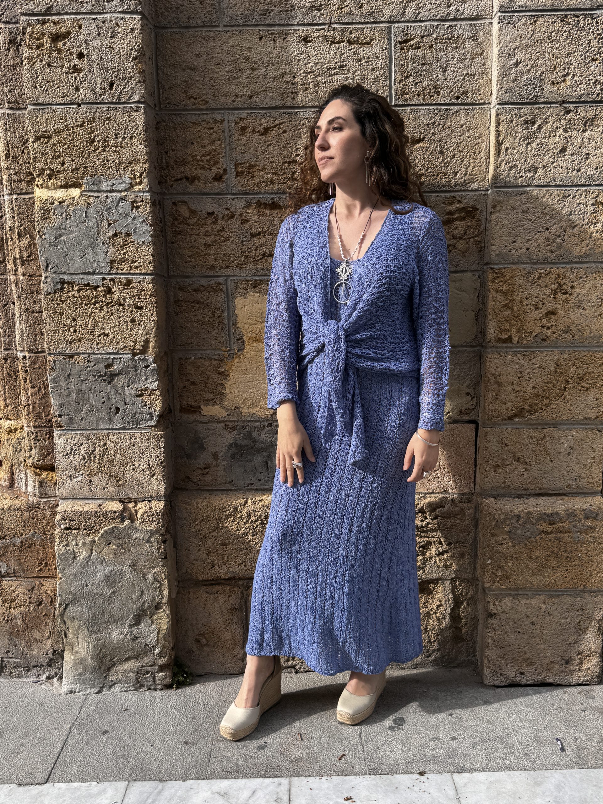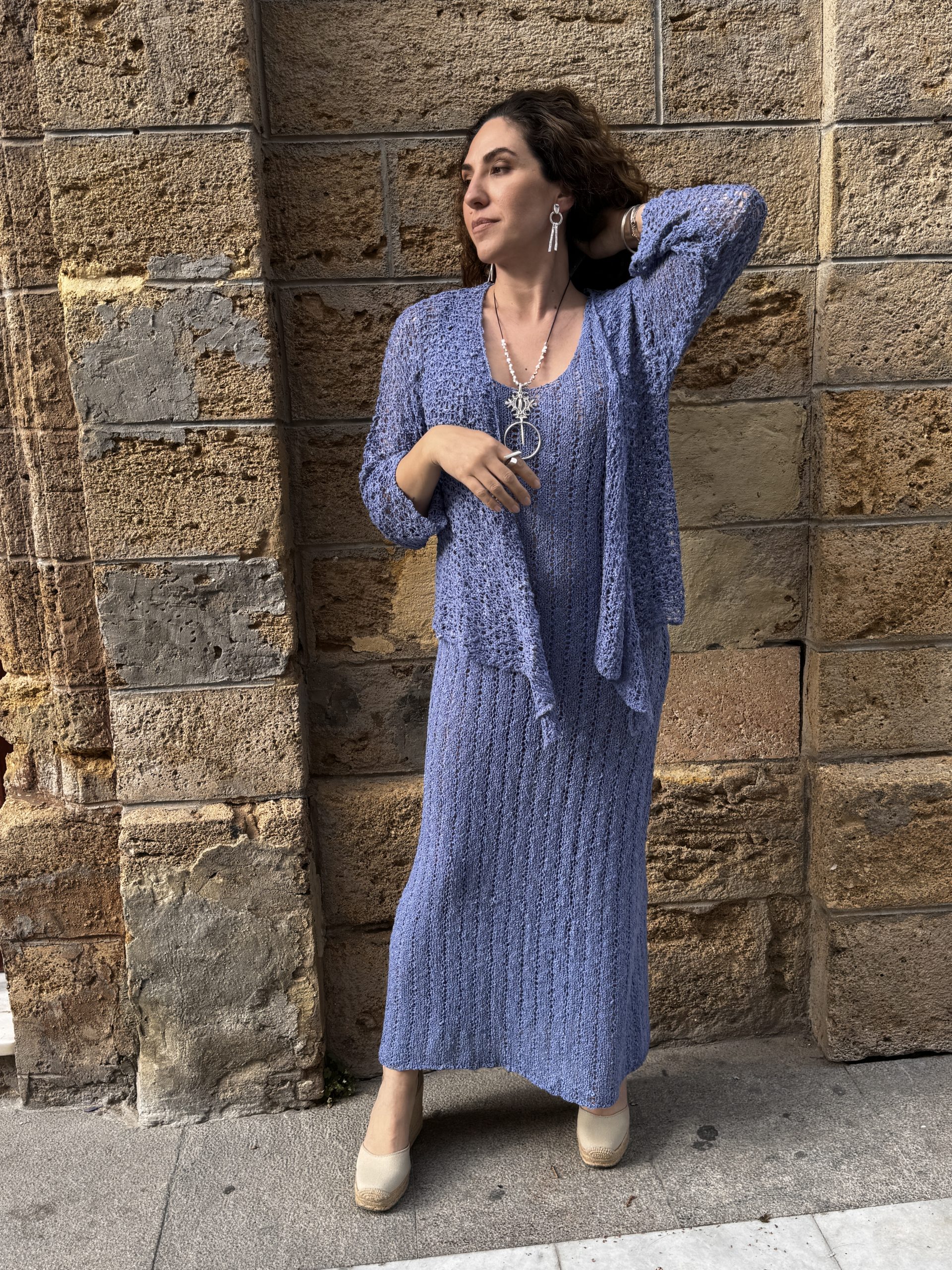 Rebeca asimetrica color azul añil. Estilo boho chic con gran caída. Caldo de tacto muy suave. Ideal para combinar con pantalones y vestidos en las noches frescas de verano.