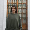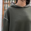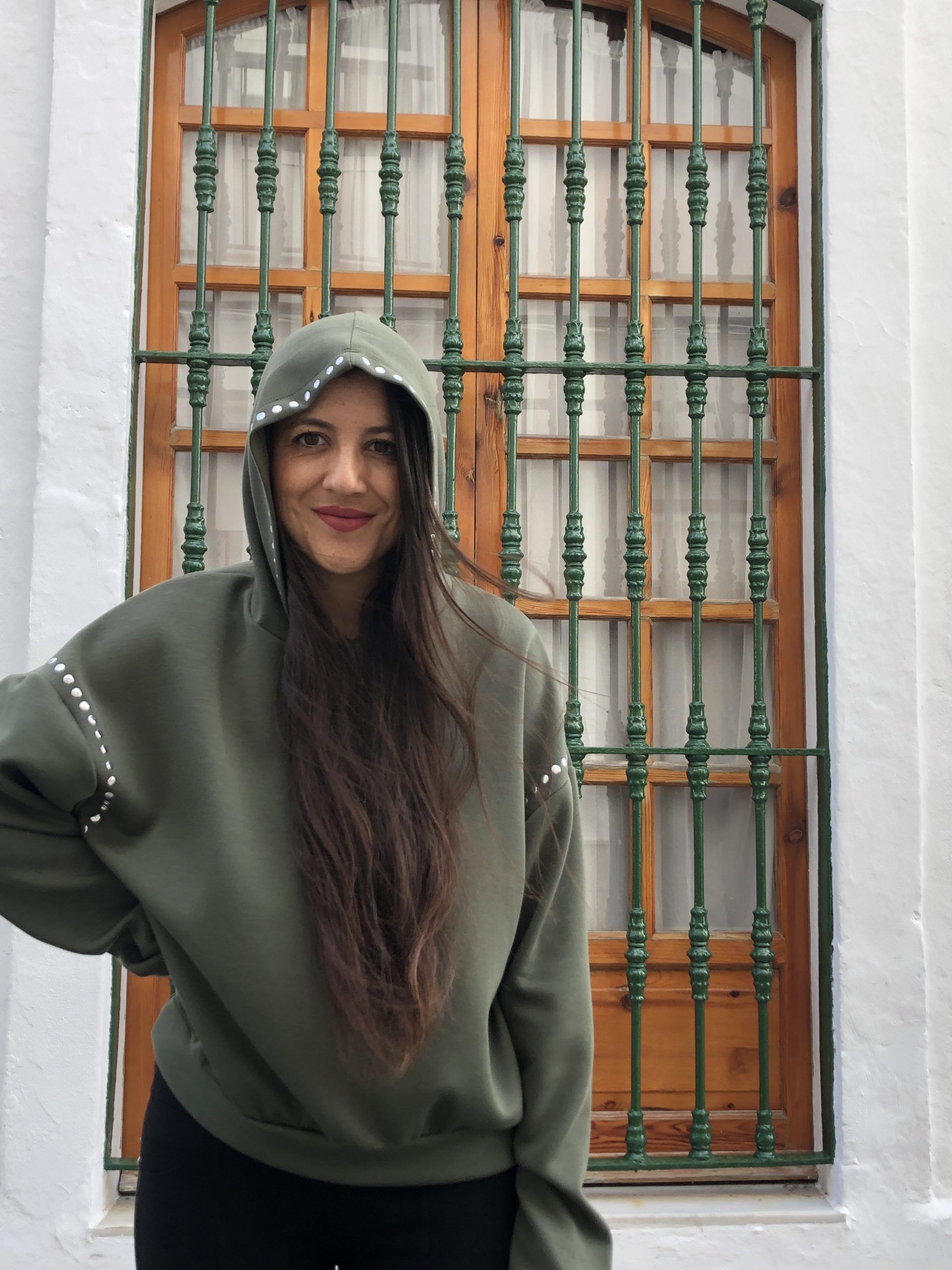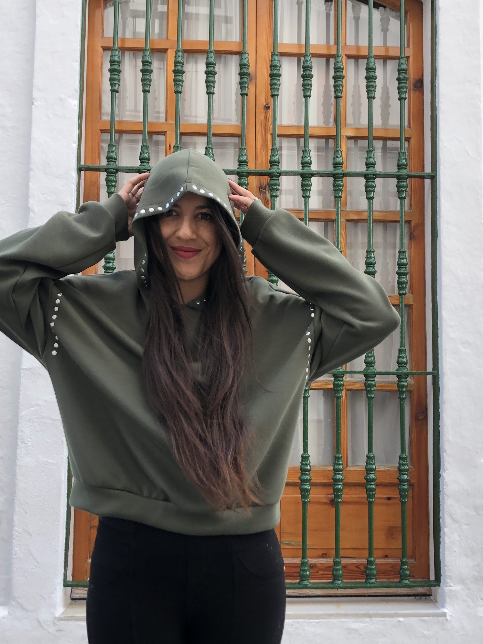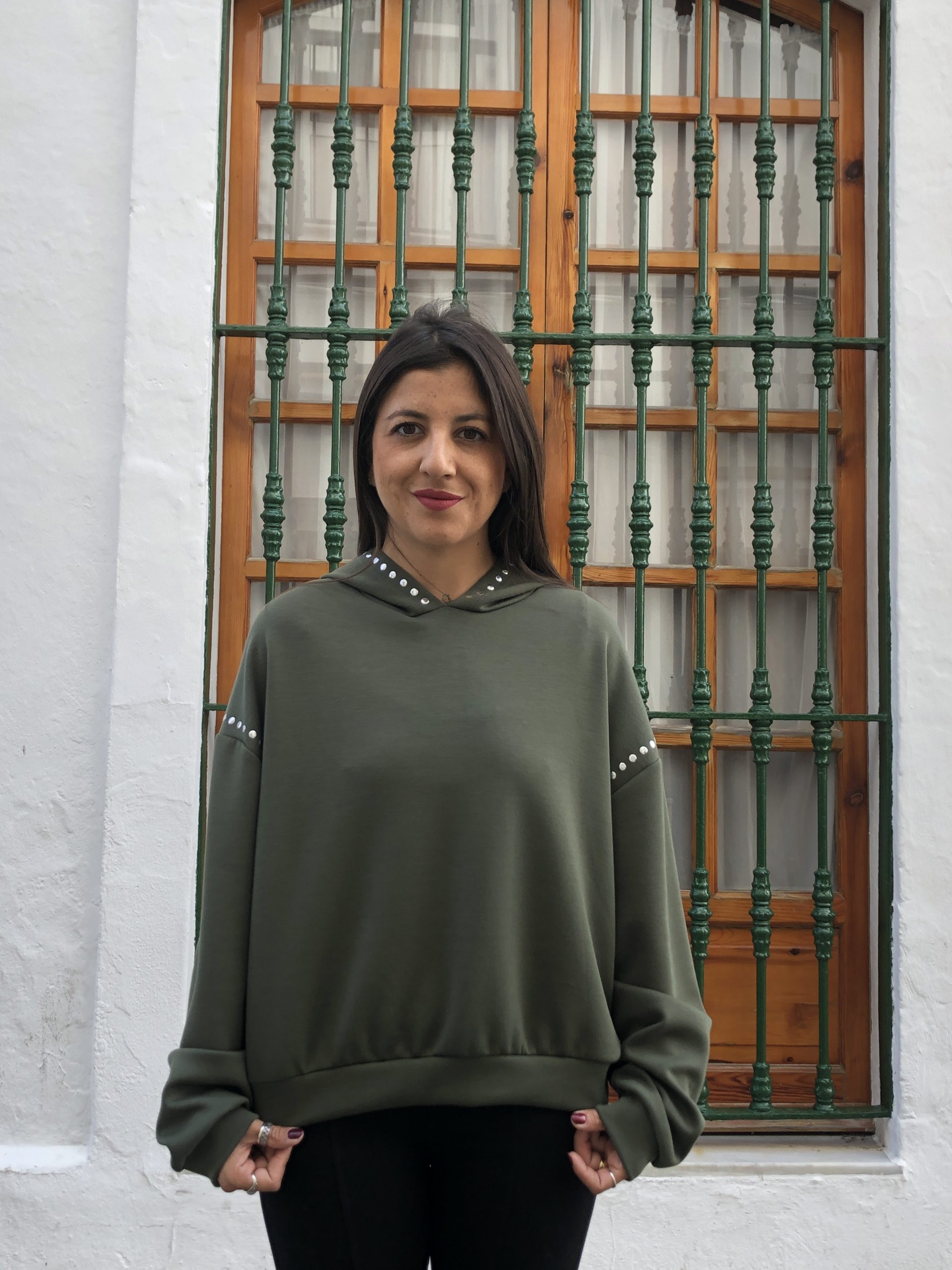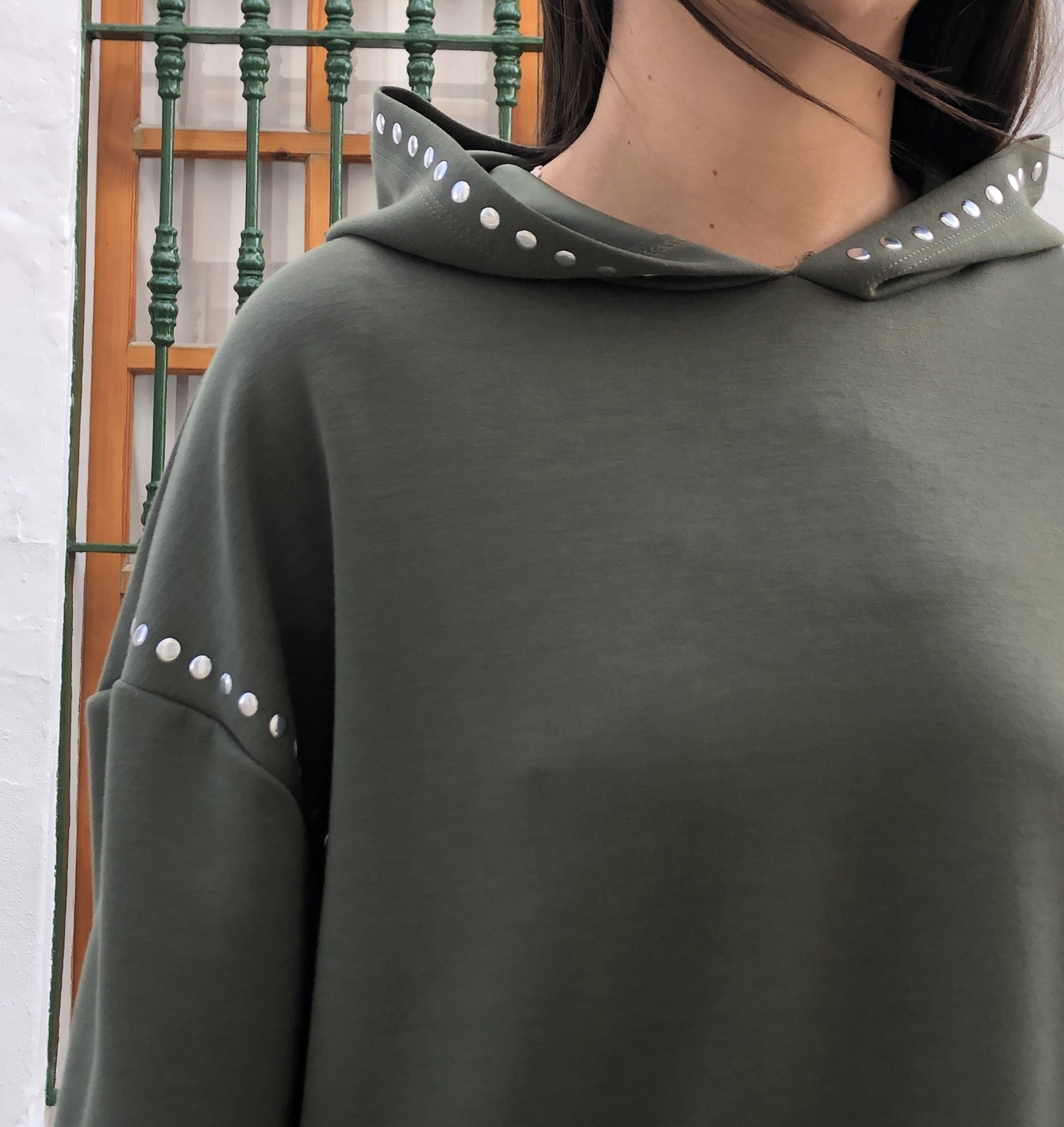 Sudadera de estilo casual con un toque sofisticado. Confeccionada en tejido suave y agradable al tacto, presenta un favorecedor color verde kaki que combina fácilmente con cualquier look. Su diseño destaca por las tachuelas metálicas decorativas en hombros, mangas y capucha, aportando un aire moderno y ligeramente rock sin perder elegancia.