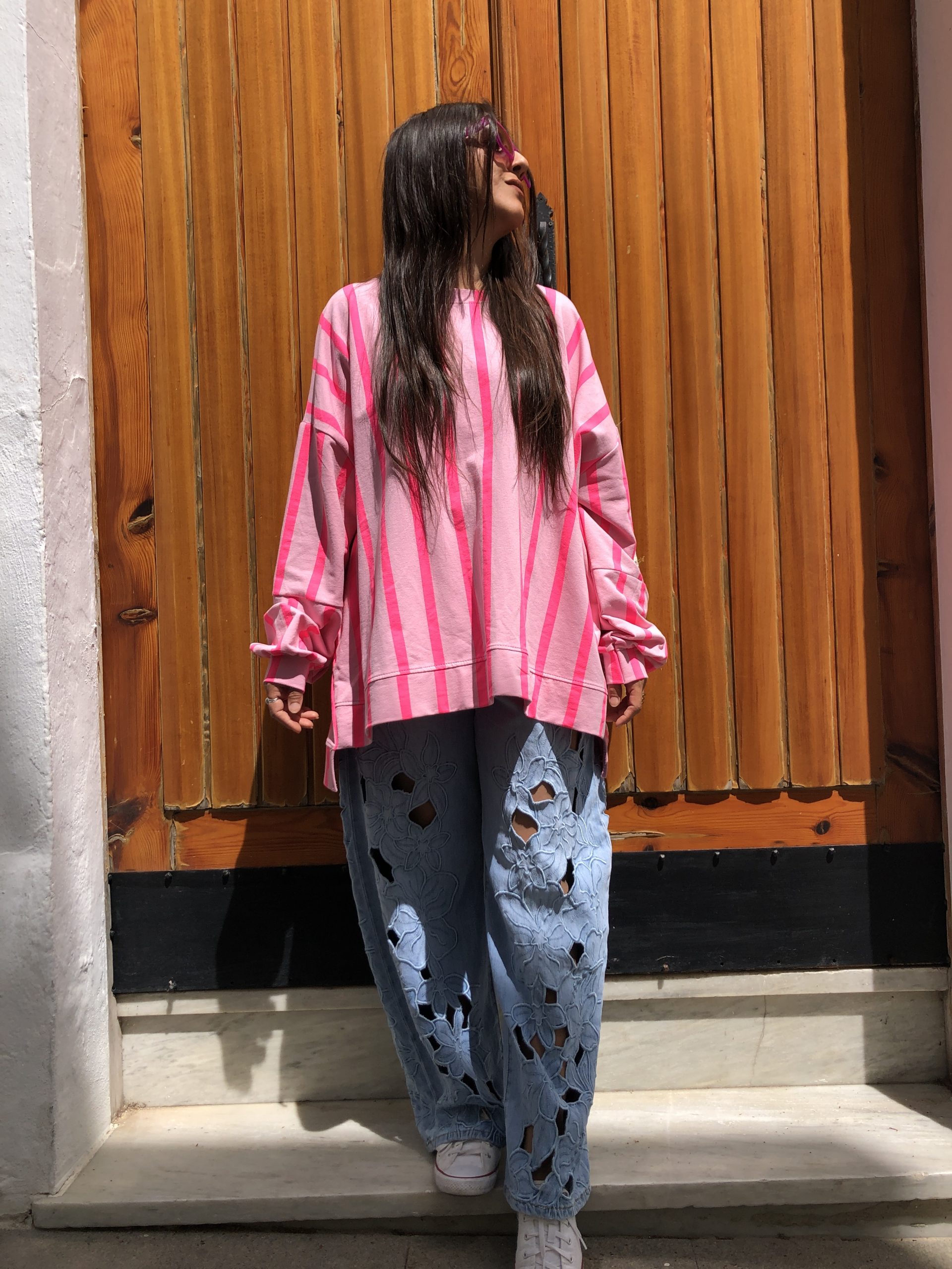 Sudadera de manga larga que fusiona audacia y delicadeza en una propuesta irresistible. Elaborada en un tejido suave y confortable, destaca por su estampado de rayas en fucsia flúor sobre un fondo rosa claro, creando un juego cromático vibrante y femenino a la vez.