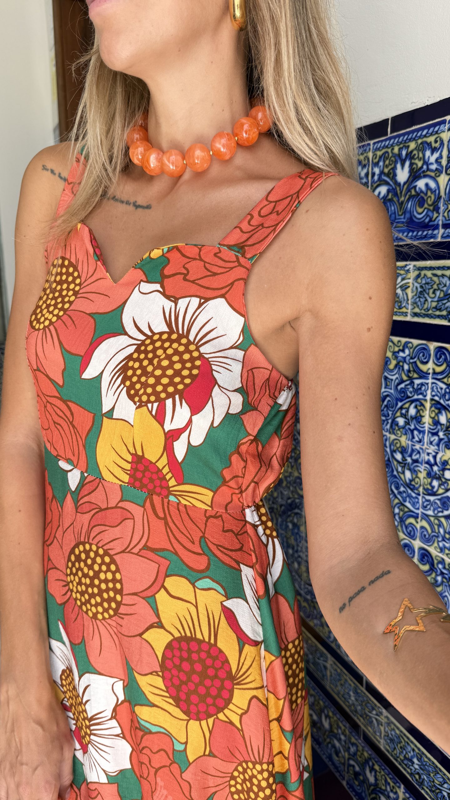 Perfecto para combinar con sandalias planas o cuñas, este vestido se transforma fácilmente de un look casual a uno más sofisticado. Añade accesorios grandes y coloridos —como pendientes llamativos o un bolso vibrante— para darle un toque alegre y moderno que contrasta maravillosamente con su esencia retro.