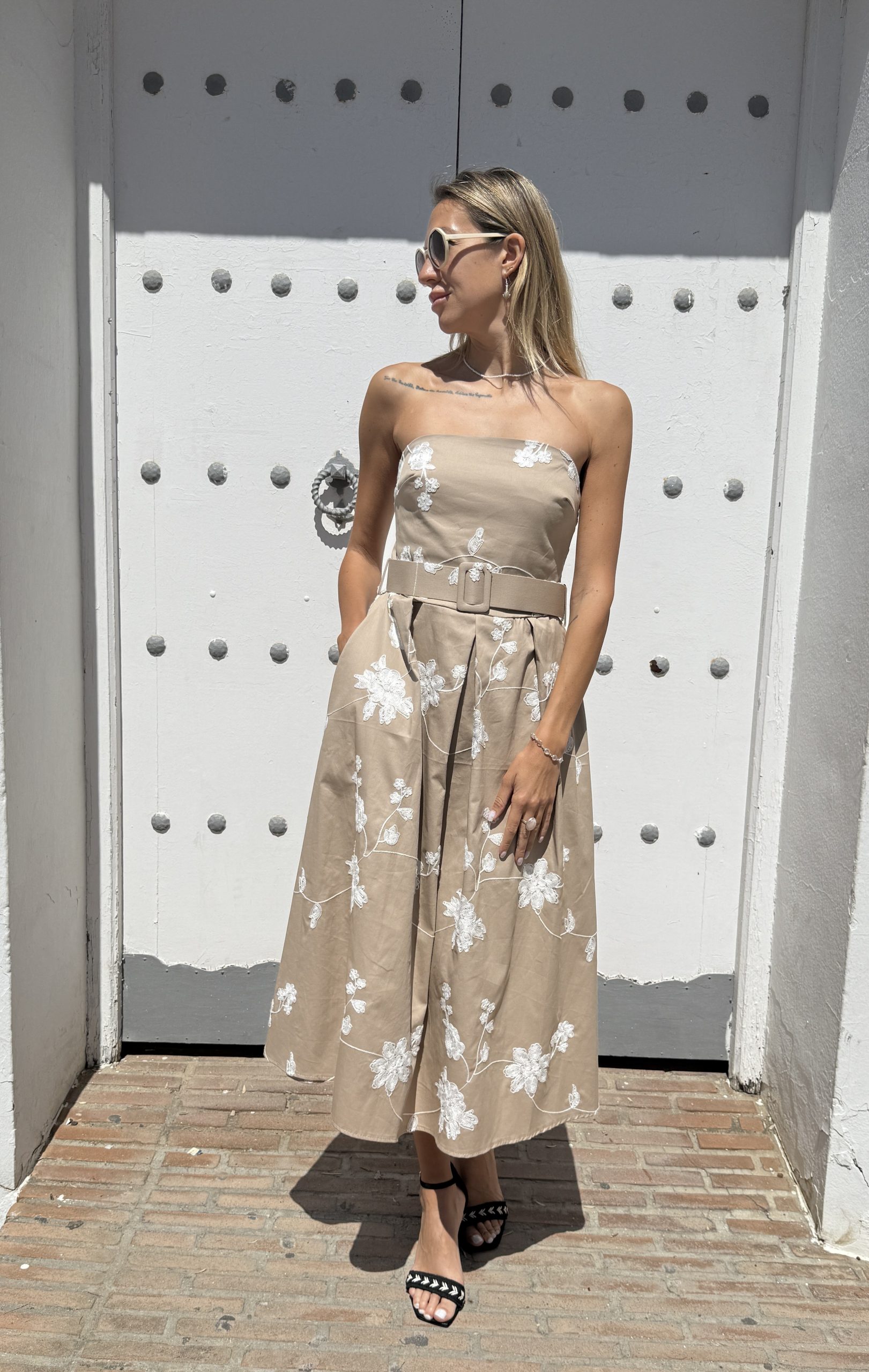 Este vestido es una pieza sumamente elegante, perfecta para ocasiones especiales. Está adornado con detalles bordados que aportan un toque de sofisticación y delicadeza a su diseño. Su corsé ajustado realza la figura, brindando una silueta elegante y femenina. Para completar el look, combínalo con unos tacones altos que realzan aún más su estilo refinado y sofisticado.