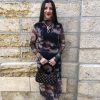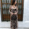 El vestido es de gasa ligera, con un tacto suave y un movimiento fluido que se acentúa gracias al pequeño vuelo en la parte de abajo. Las mangas son semitransparentes y el corte general es cómodo y femenino.