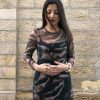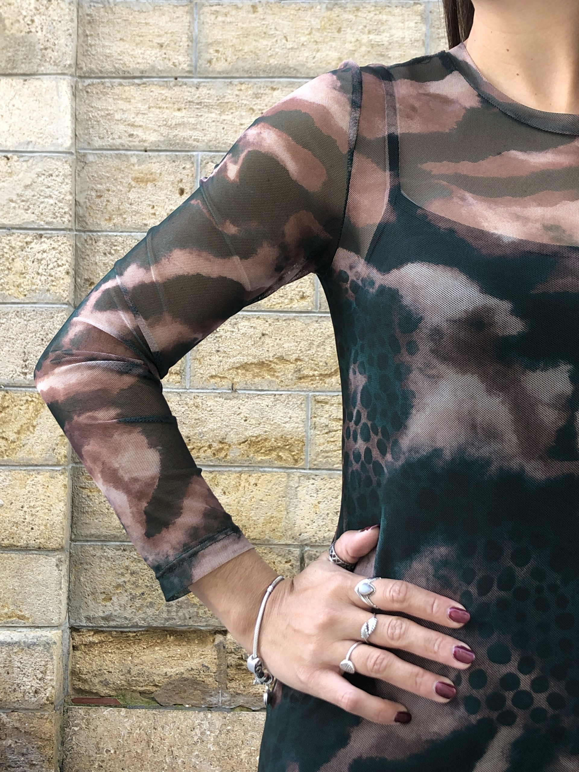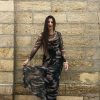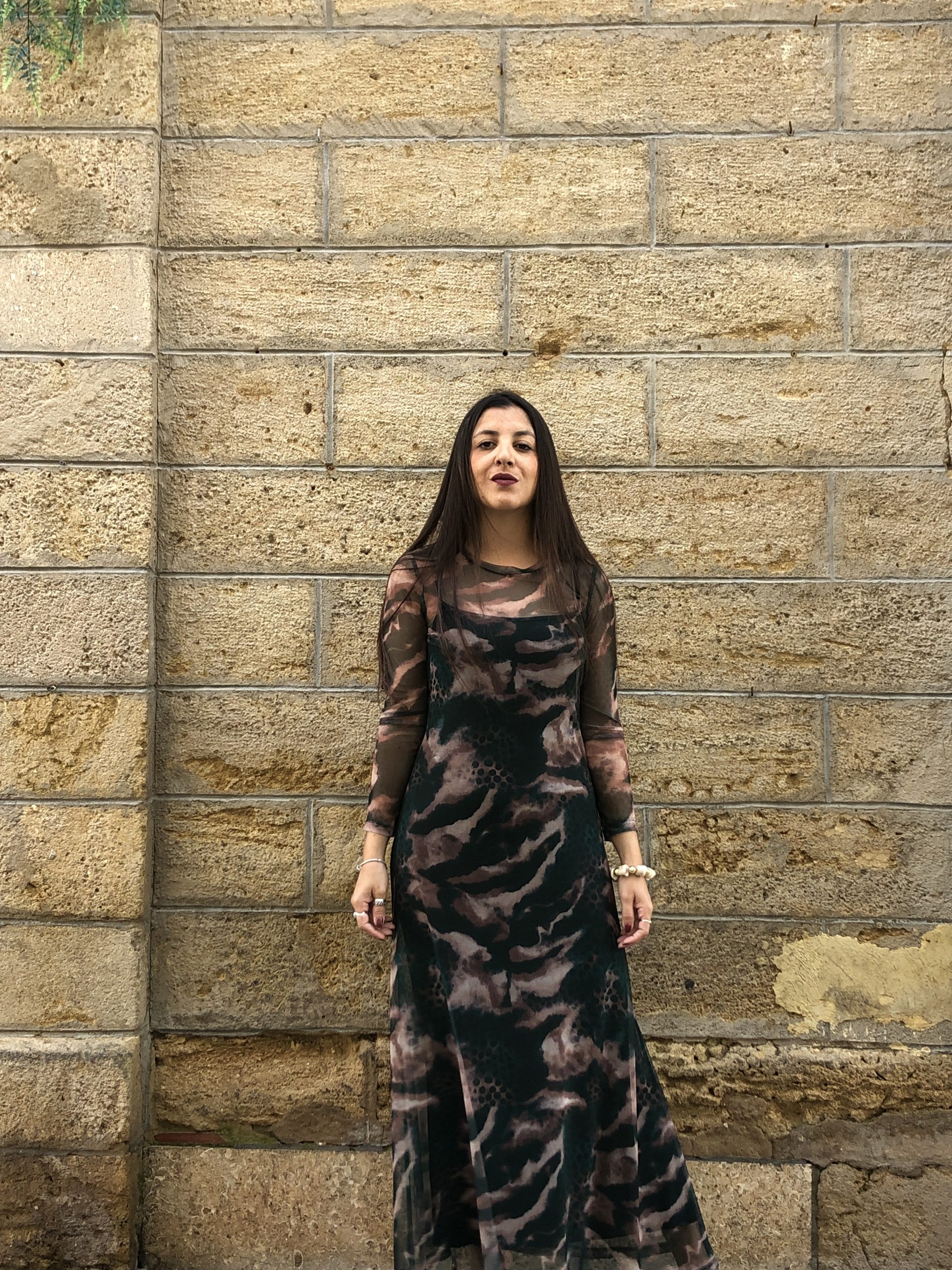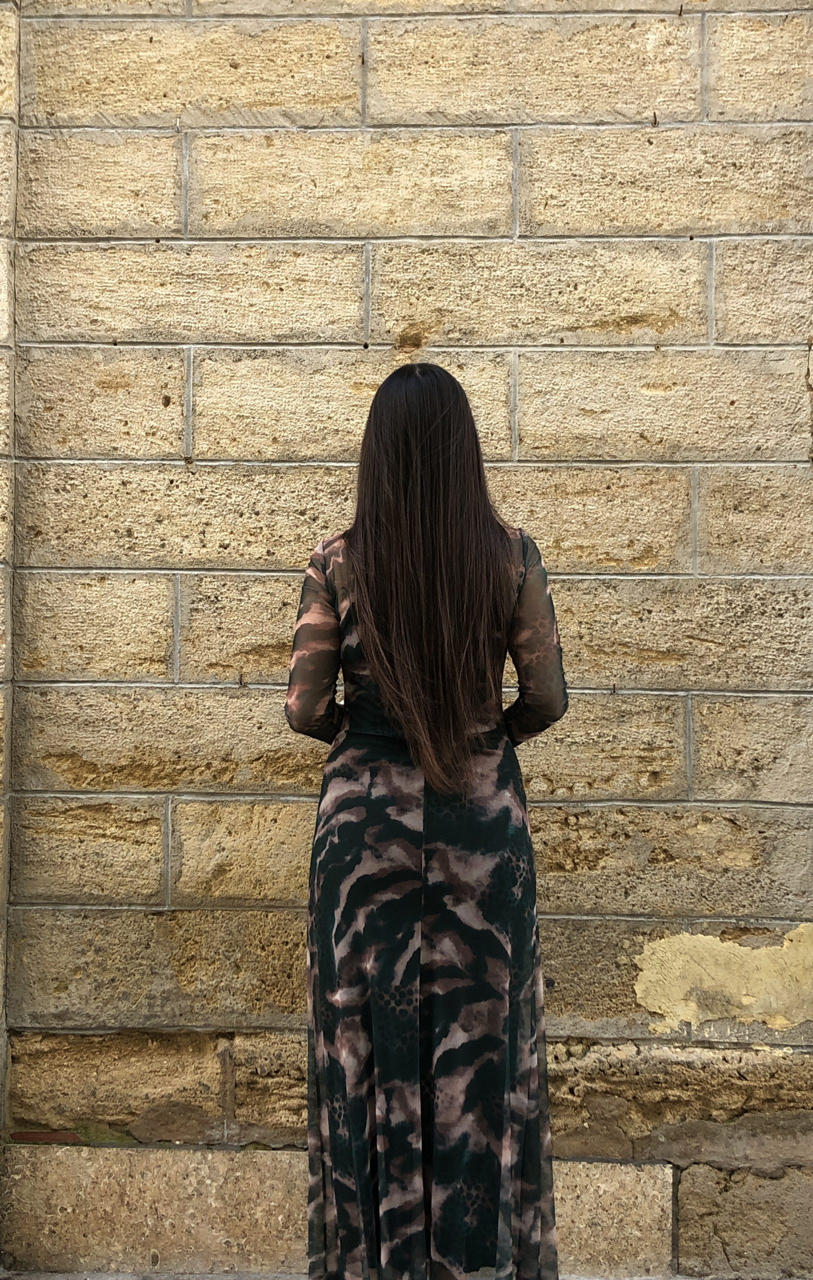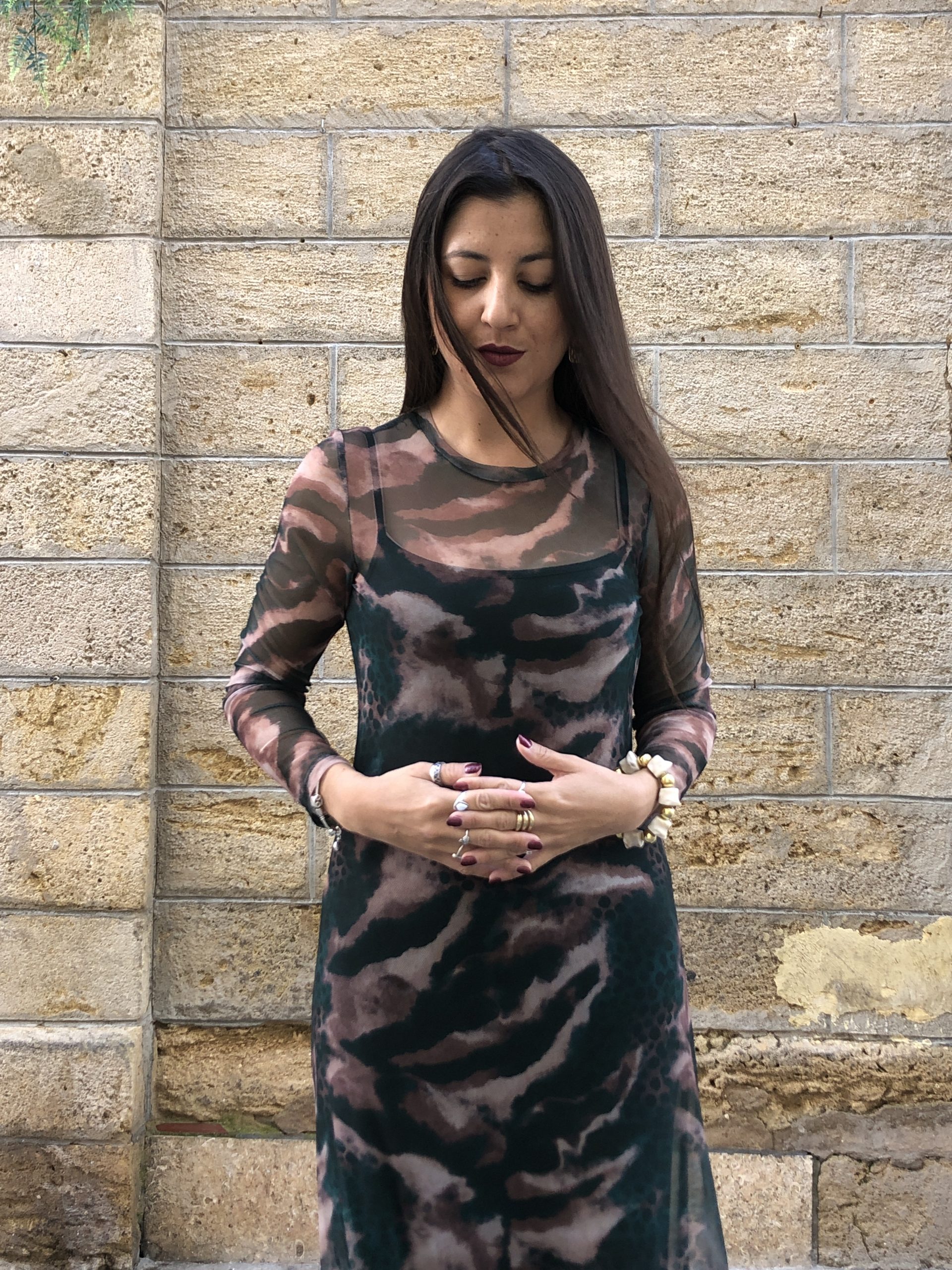 Vestido largo de gasa verde botella con delicado print de manchas color arena. Ligero, fluido y con un aire boho-chic, se mueve con elegancia y aporta un toque natural y sofisticado perfecto para ocasiones especiales o looks relajados con estilo.