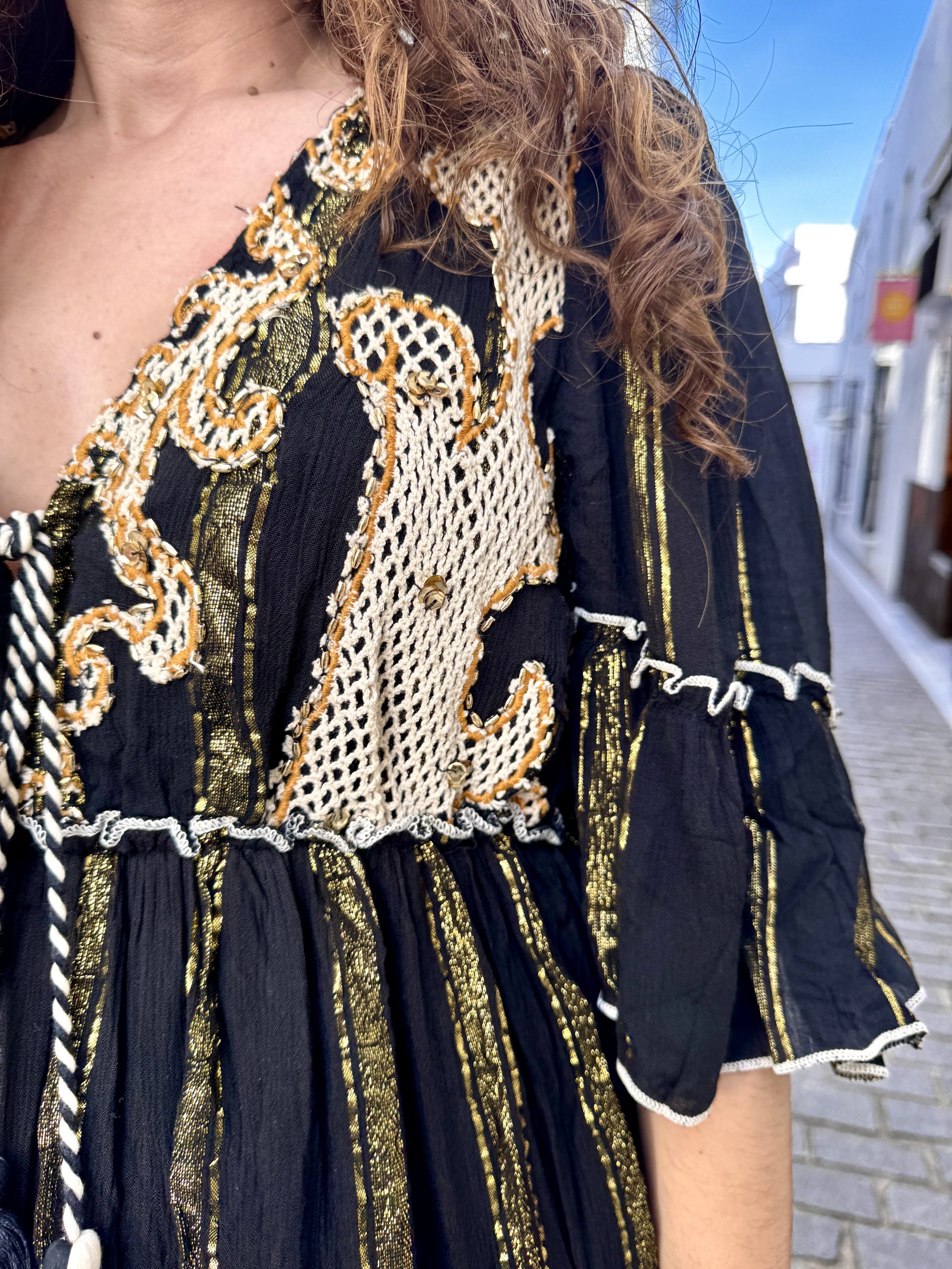 Vestido de algodón bordado e incrustaciones estilo boho chic.
