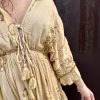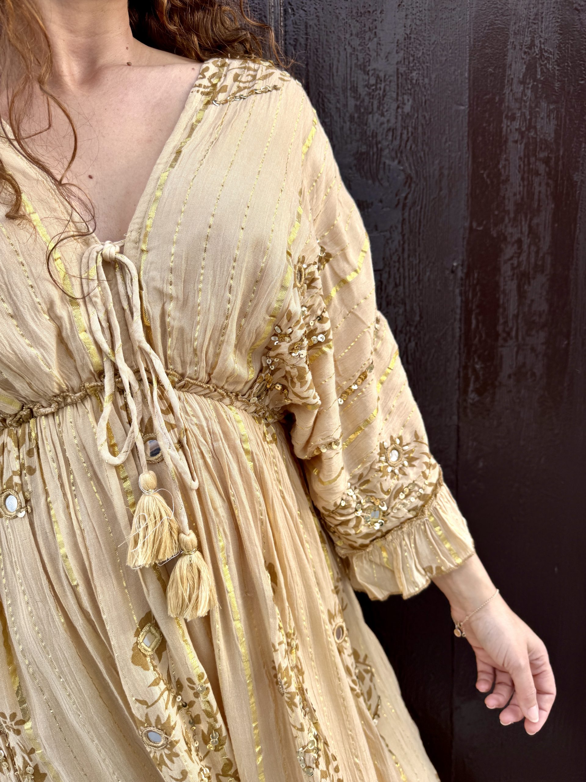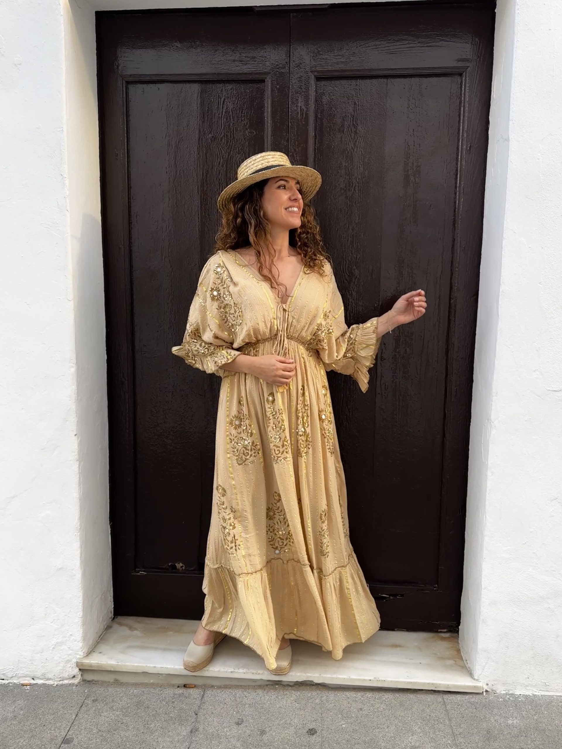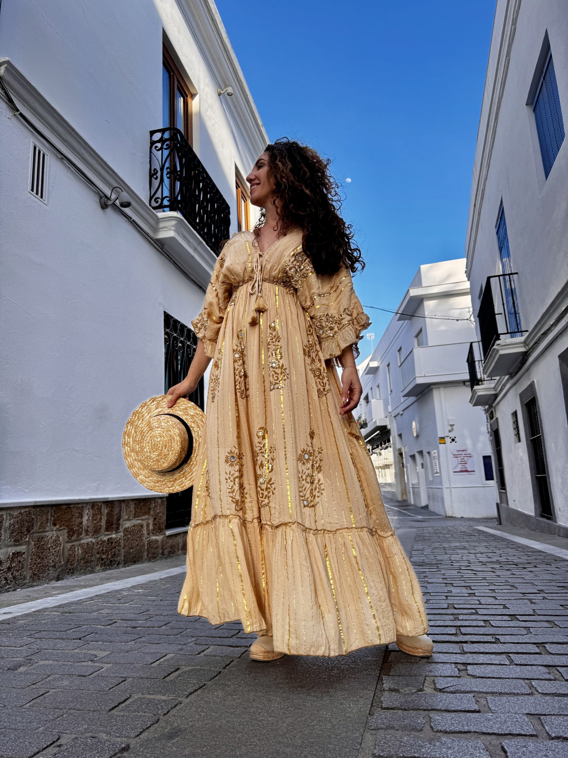 Vestido en tono dorado lleno de detalles bordados y destellos dorados que captan la luz con cada movimiento.