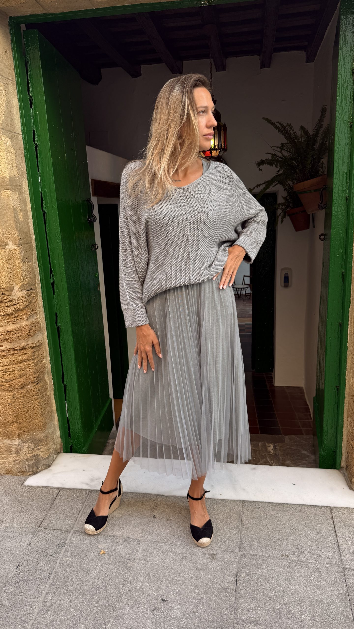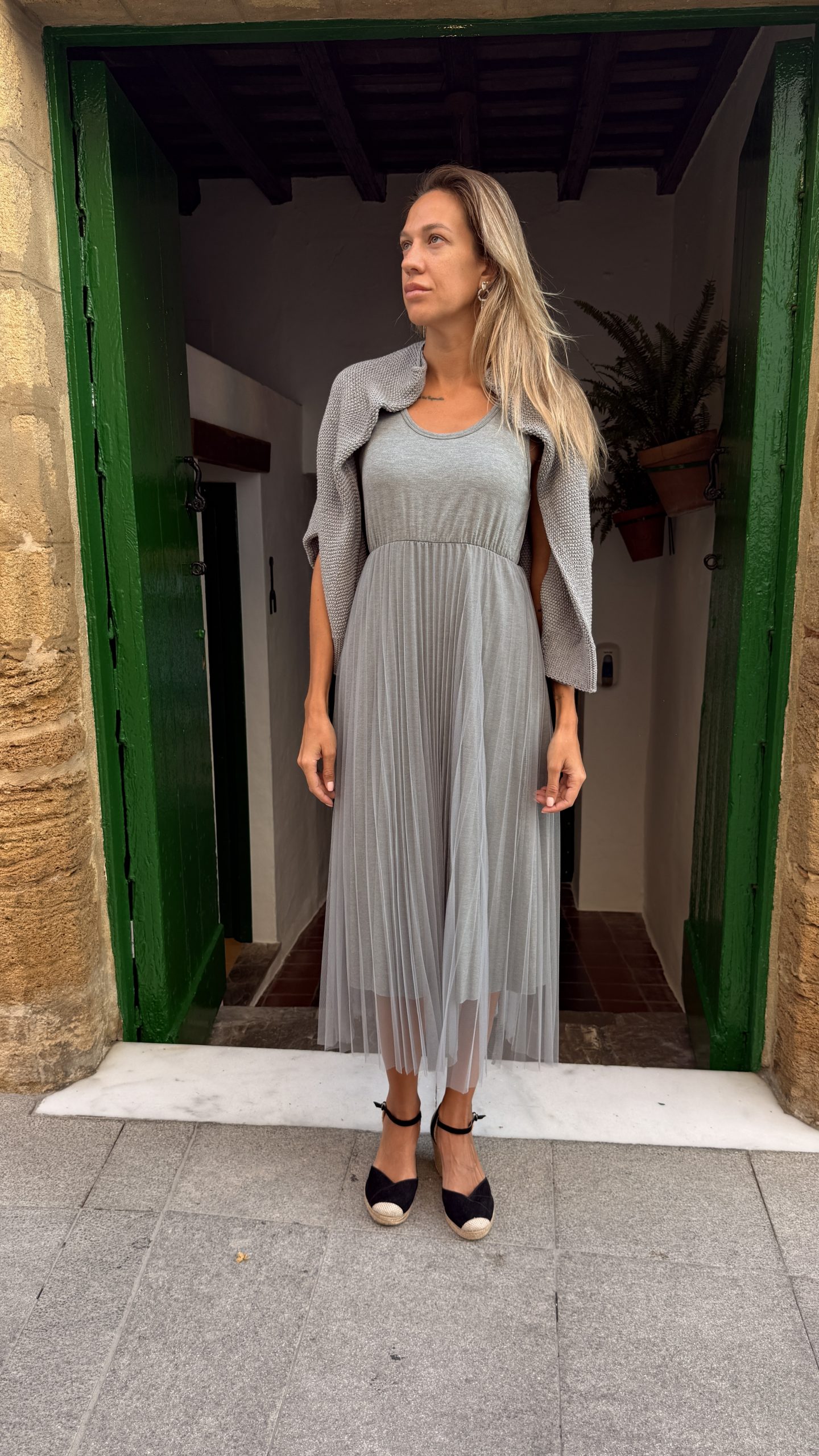 Conjunto encantador compuesto por un vestido y un jersey, ideal tanto para llevar junto como por separado. El vestido presenta una parte superior tipo camiseta elástica que se adapta cómodamente al cuerpo, combinada con una falda de tul ligera y vaporosa que aporta un toque de dulzura y movimiento. El jersey, de tejido muy suave y suelto, ofrece una sensación de confort absoluto y un estilo desenfadado. Perfecto para crear un look completo y armonioso, o para combinar con otras prendas y adaptarse a distintas ocasiones.