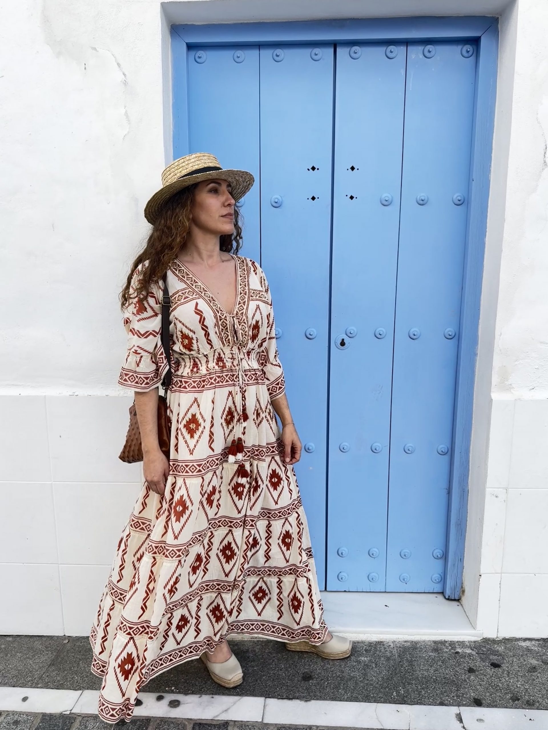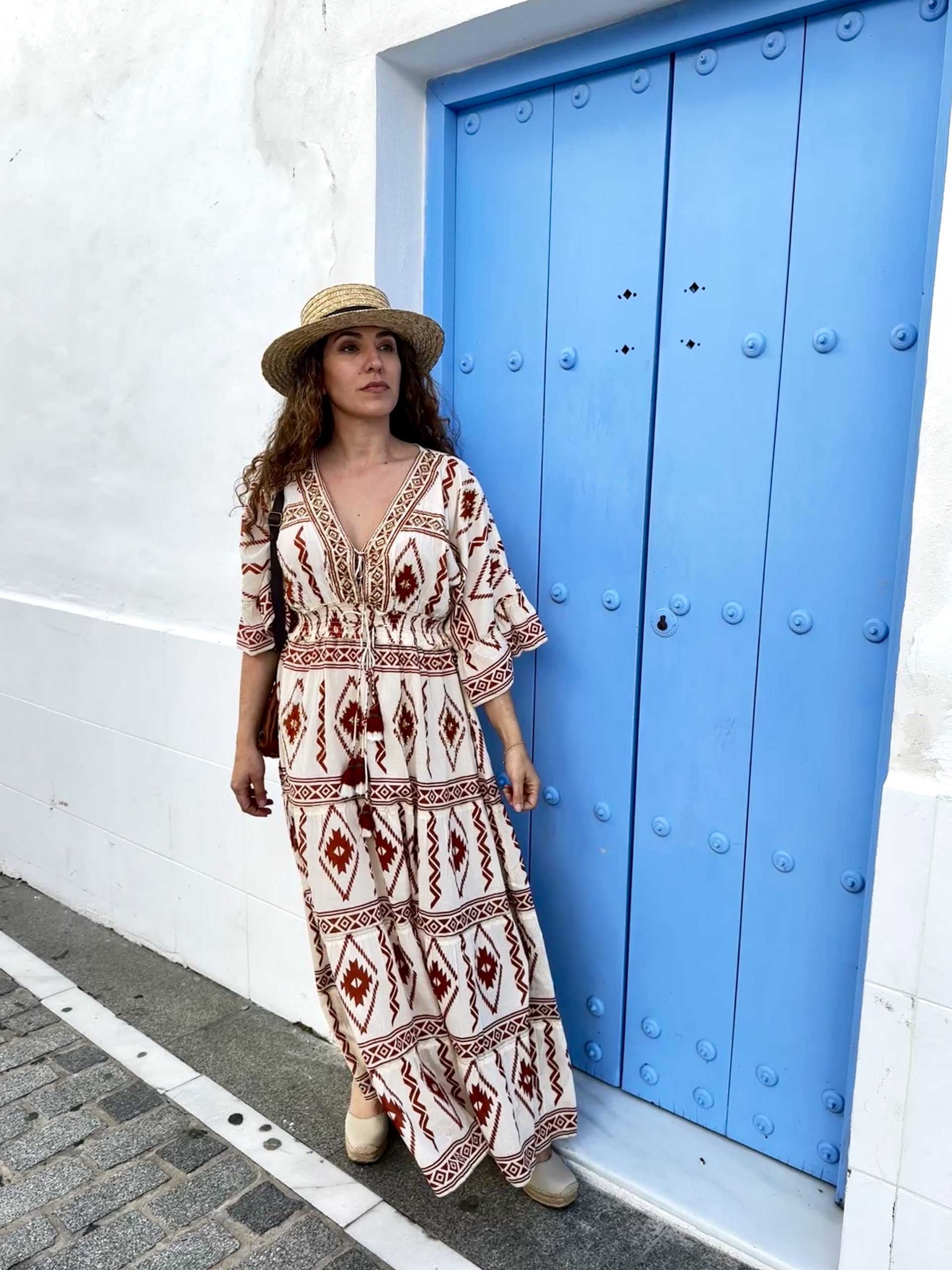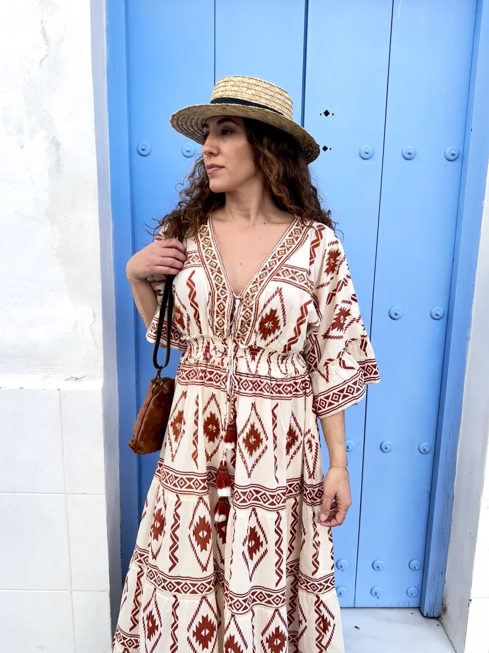 Espalda en V . Se estrecha con banda elástica y tira en la cintura y el escote se puede hacer mas o menos pronunciado según el gusto con el cordón frontal.