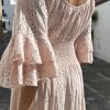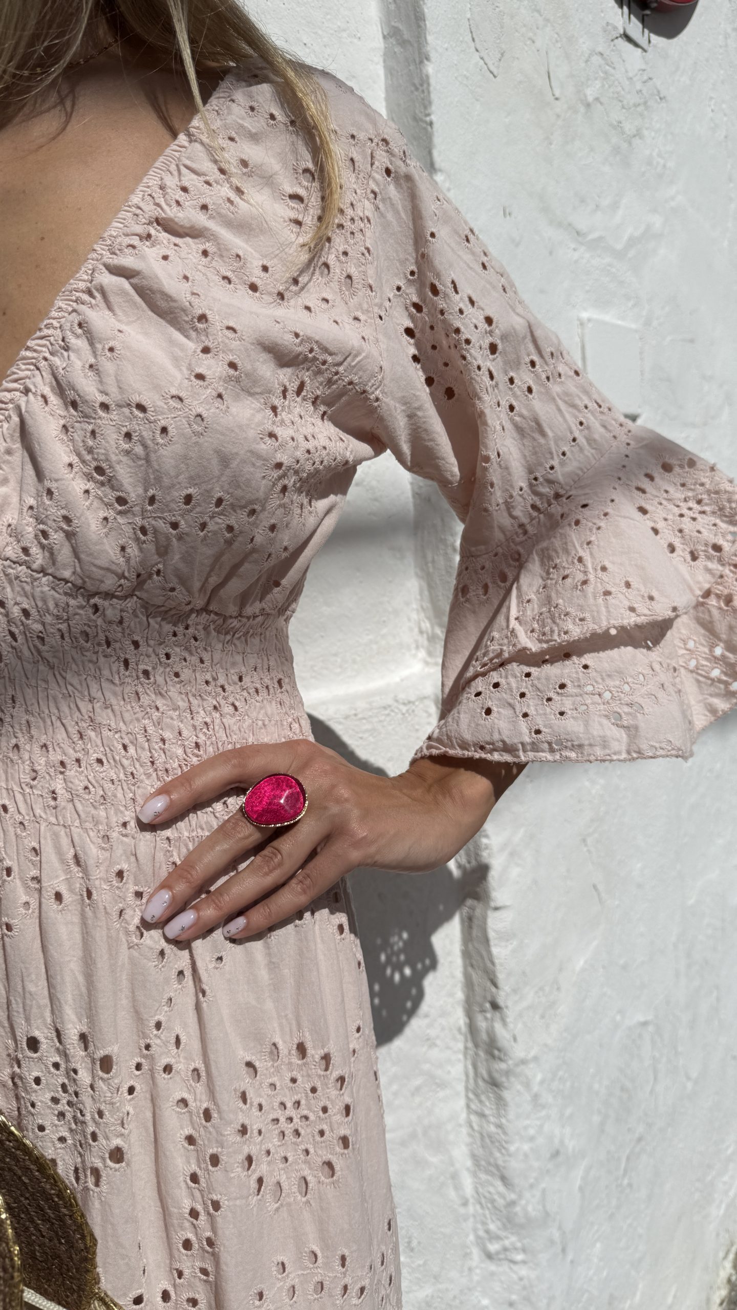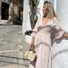 Este encantador vestido de estilo romántico es una verdadera joya en cualquier armario. Su diseño ligero y fresco lo convierte en la elección perfecta para días soleados y noches mágicas. Decorado con delicados bordados que añaden un toque artesanal, este vestido irradia una belleza etérea. Las volantes sutiles que adornan la prenda aportan un aire boho chic, creando un look despreocupado y lleno de personalidad.